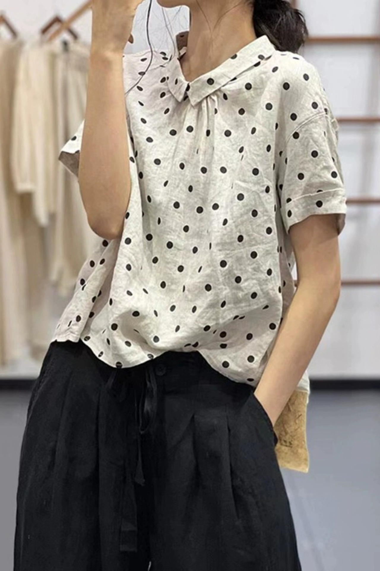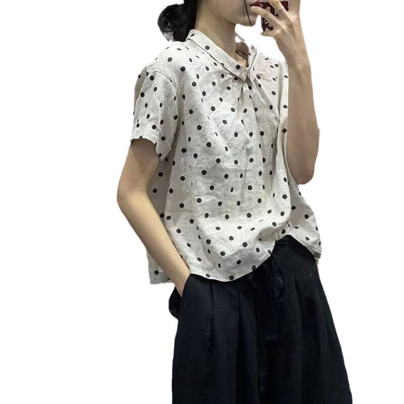 クリアランスカウンター最後の在庫 ese コットンとリネンの水玉模様のシャツ レディース ルーズ リネン 半袖 ベビードール トップ sine88300675278