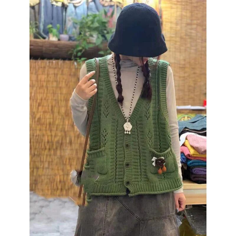 クリアランス漏れ〜カウンタービッグブランド牛Vネックニットベストジャケットレディースルーズ中空カーディガンノースリーブセーター秋 オータム 秋物 sine68152088605