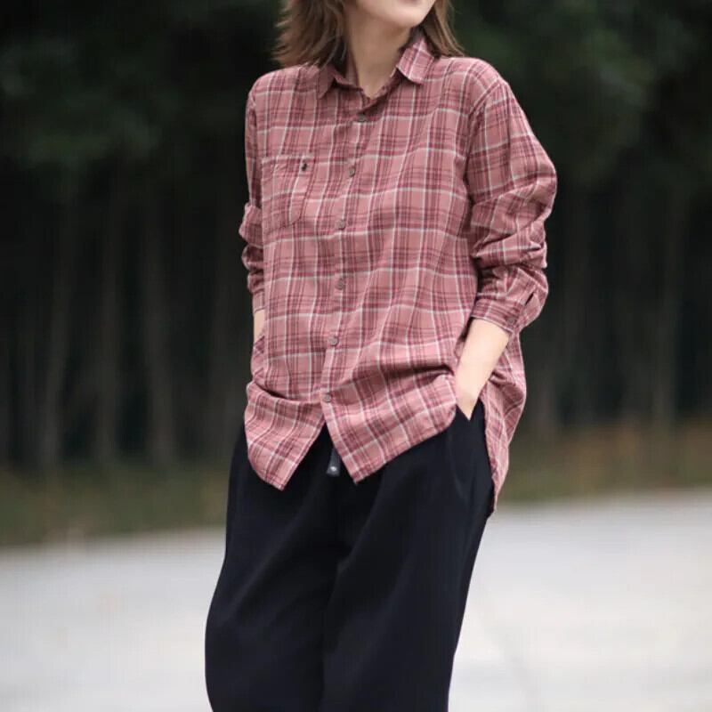 モールビッグネーム撤退香港スタイルレトロチェック柄ラペルシャツレディースルーズカジュアル長袖トップ秋 ロング オータム 秋物 sine84733114877
