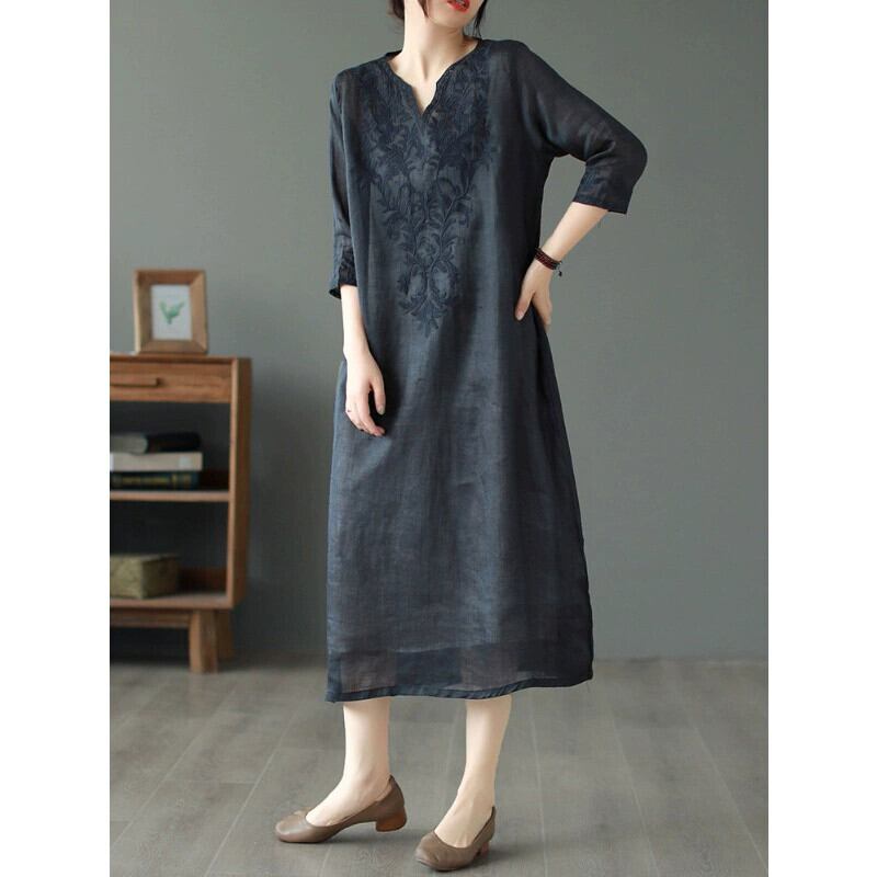 クリアランス漏れ〜レトロな厚手の刺繍入りコットンとリネンのドレス、ゆったりとしたスリムなリネンのVネックローブ、カウンターで販売 レッド sine48998917491