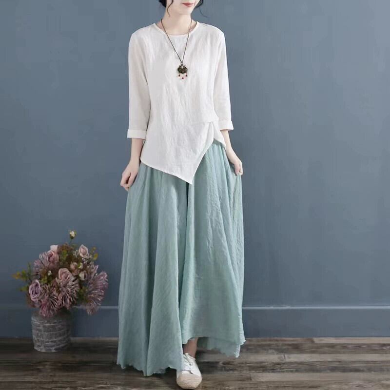Eign Trade 割引ブランドテールグッズレトロコットンとリネンプルオーバートップ女性のルーズ不規則なリネン長袖ボトム Tシャツ ロング sine16866798309