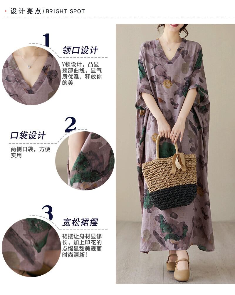 ファーストラインブランド eign trade 最終在庫綿とリネンのプリントドレスレディースゆったり大きいサイズ V ネック休暇ビーチドレス コットン 大きめサイズ Vネック sine56007072293