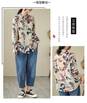 ese とオリジナル eign trade 有名商品芸術的なプリントリネンシャツ女性の秋のゆったりとした気質ラペル綿とリネンのトップ コットン オータム 秋物 sine98480811487