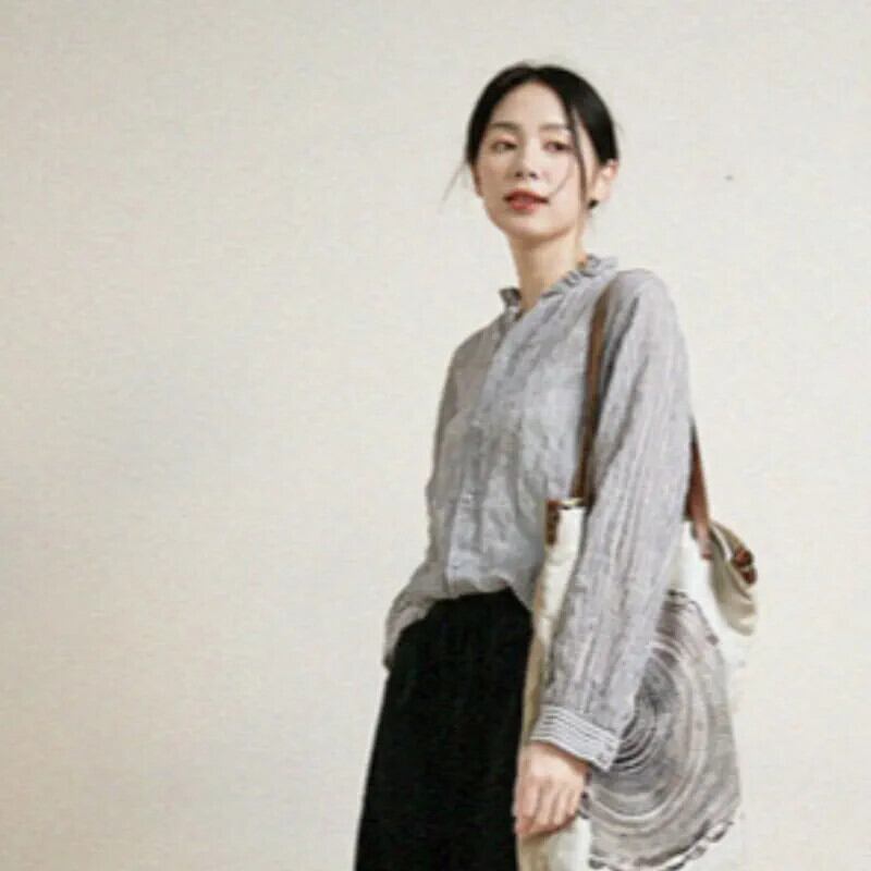 eign trade ese オリジナルハイエンドブランド香港スタイルのストライプ長袖シャツ女性のルーズカジュアル綿麻耳襟トップ ロング コットン sine96743196405
