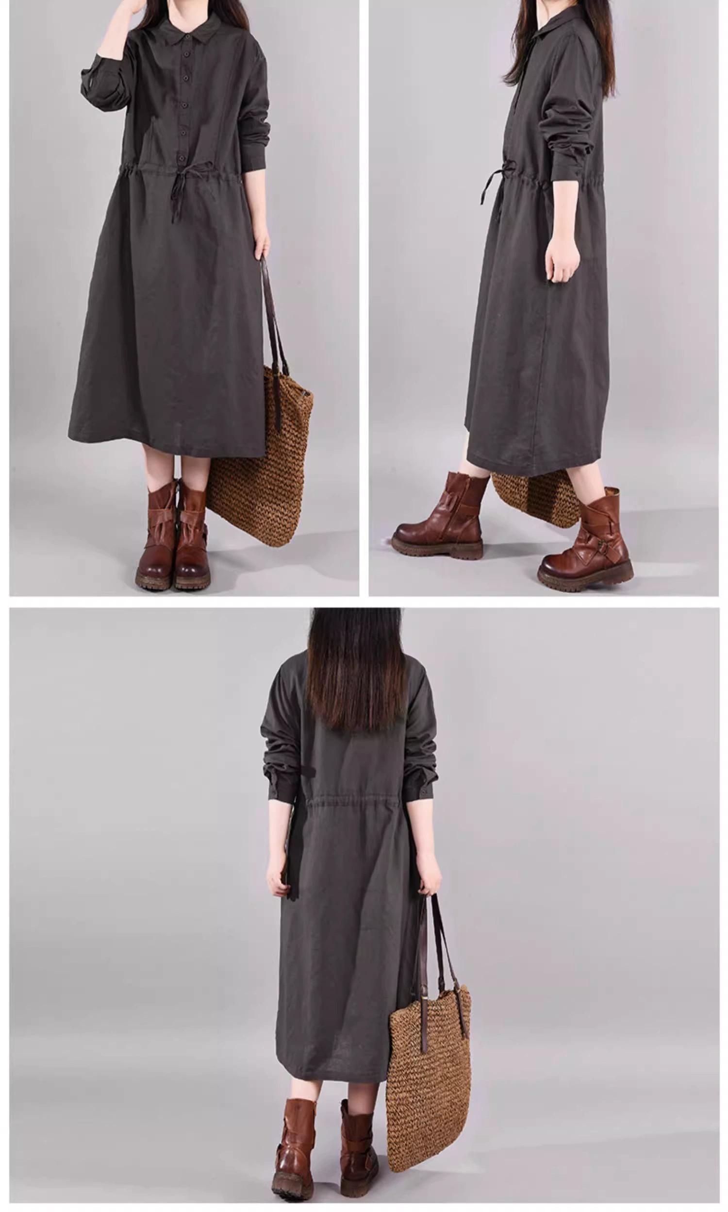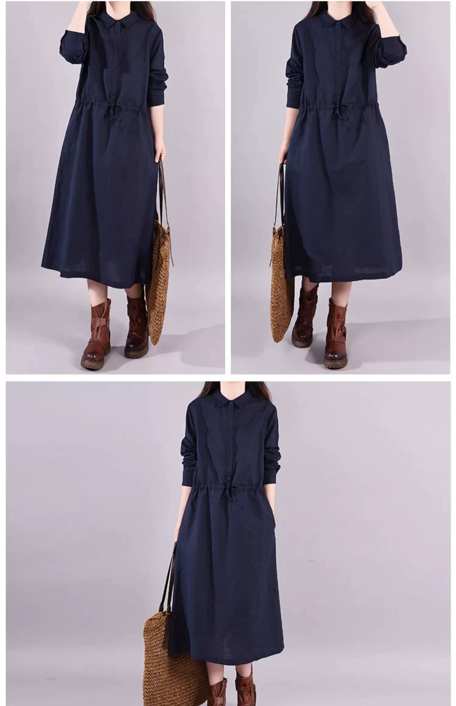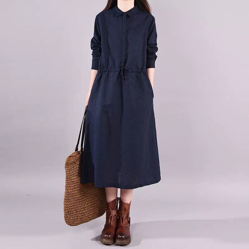 Eign Trade 割引ブランドテールグッズ綿とリネンのシャツドレス女性の初秋ルーズウエストレースアップリネンミドル丈スカート コットン オータム 秋物 sine12719265106