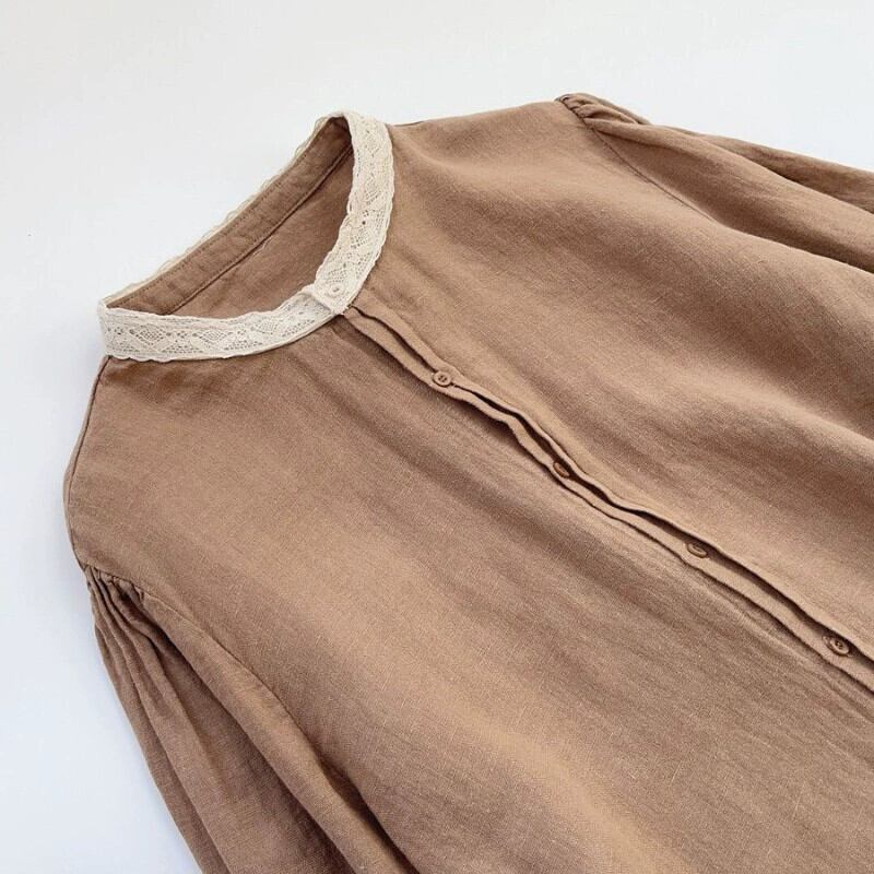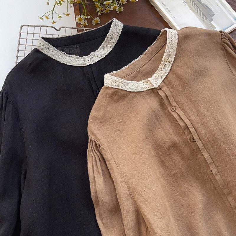 Eign Trade Export Big Tail Goods 撤退コットンとリネン長袖シャツレディースルーズカジュアルレースエッジスタンドカラーリネントップ ロング sine90113785748