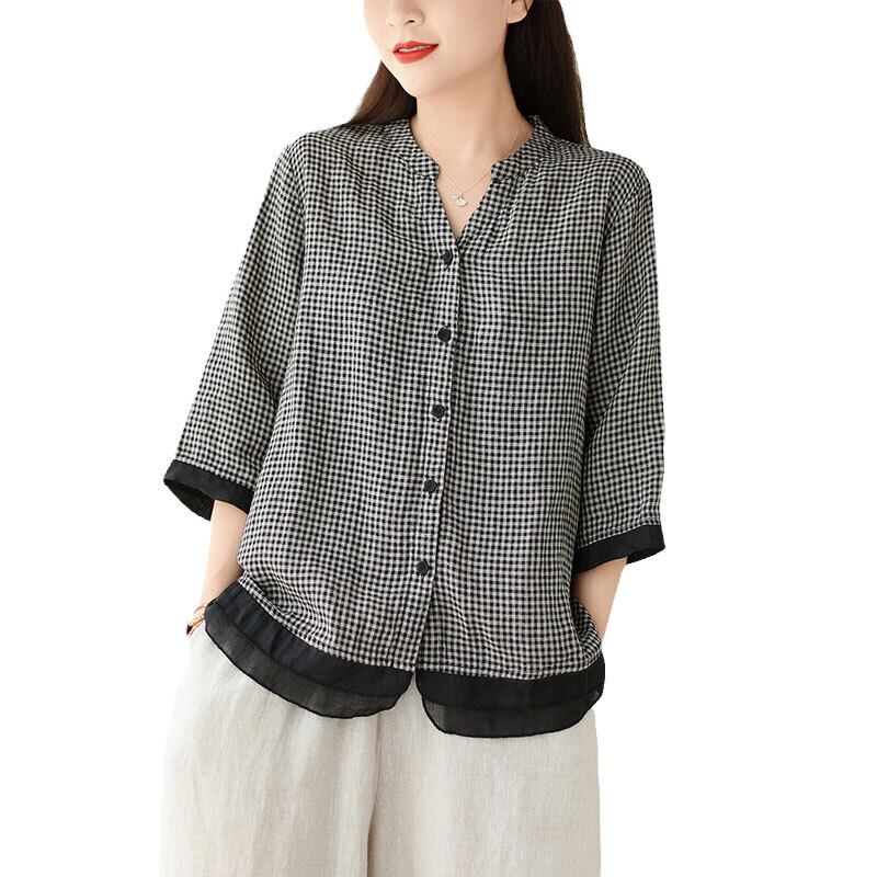 eign trade ese オリジナル高級ブランド ese リネンチェック柄シャツレディースルーズ V ネック綿麻半袖トップス コットン Vネック sine65715537395