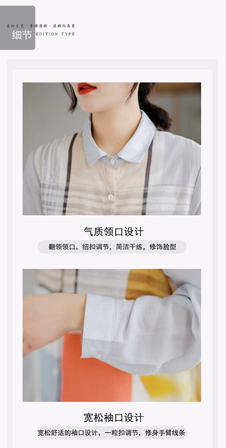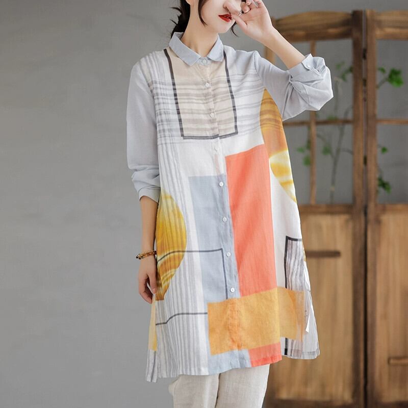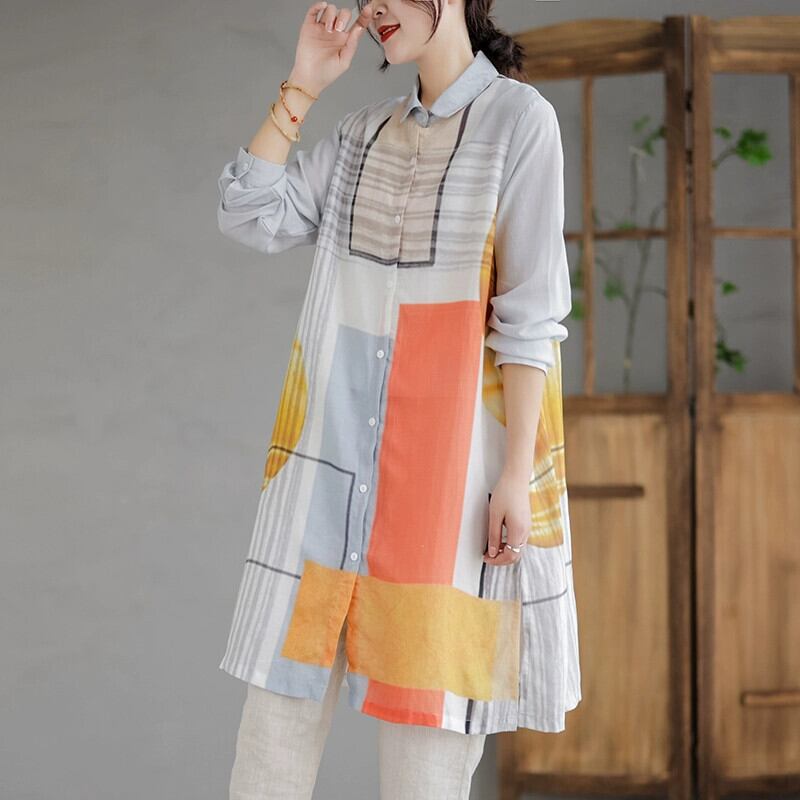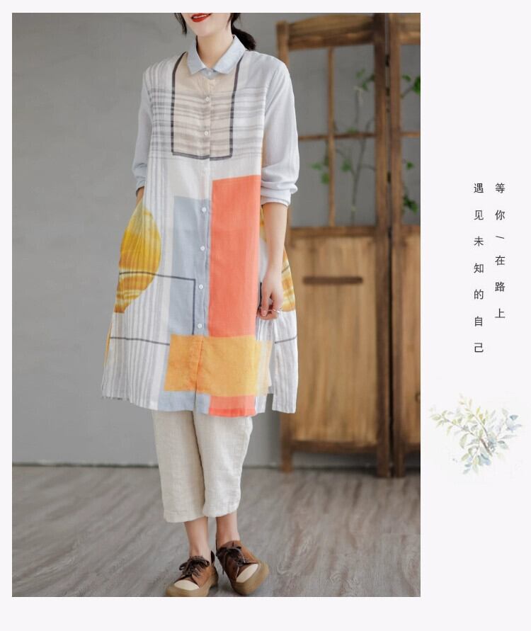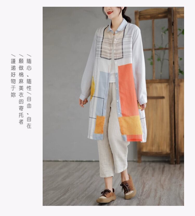 クリアランスカウンター最後の在庫、コントラストプリントコットンとリネンシャツ、レディースルーズリネンミッドレングスカーディガントップ sine13981425627