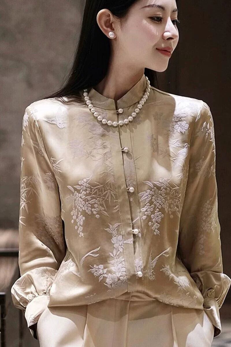 第一線のブランド eign trade 撤退最後の在庫新しい中国風国民風ジャカード重工業ビーズアセテートサテンスタンドカラーシャツ女性 sine2658569098