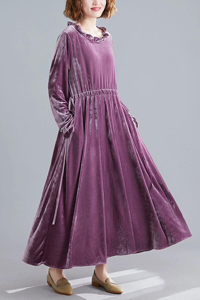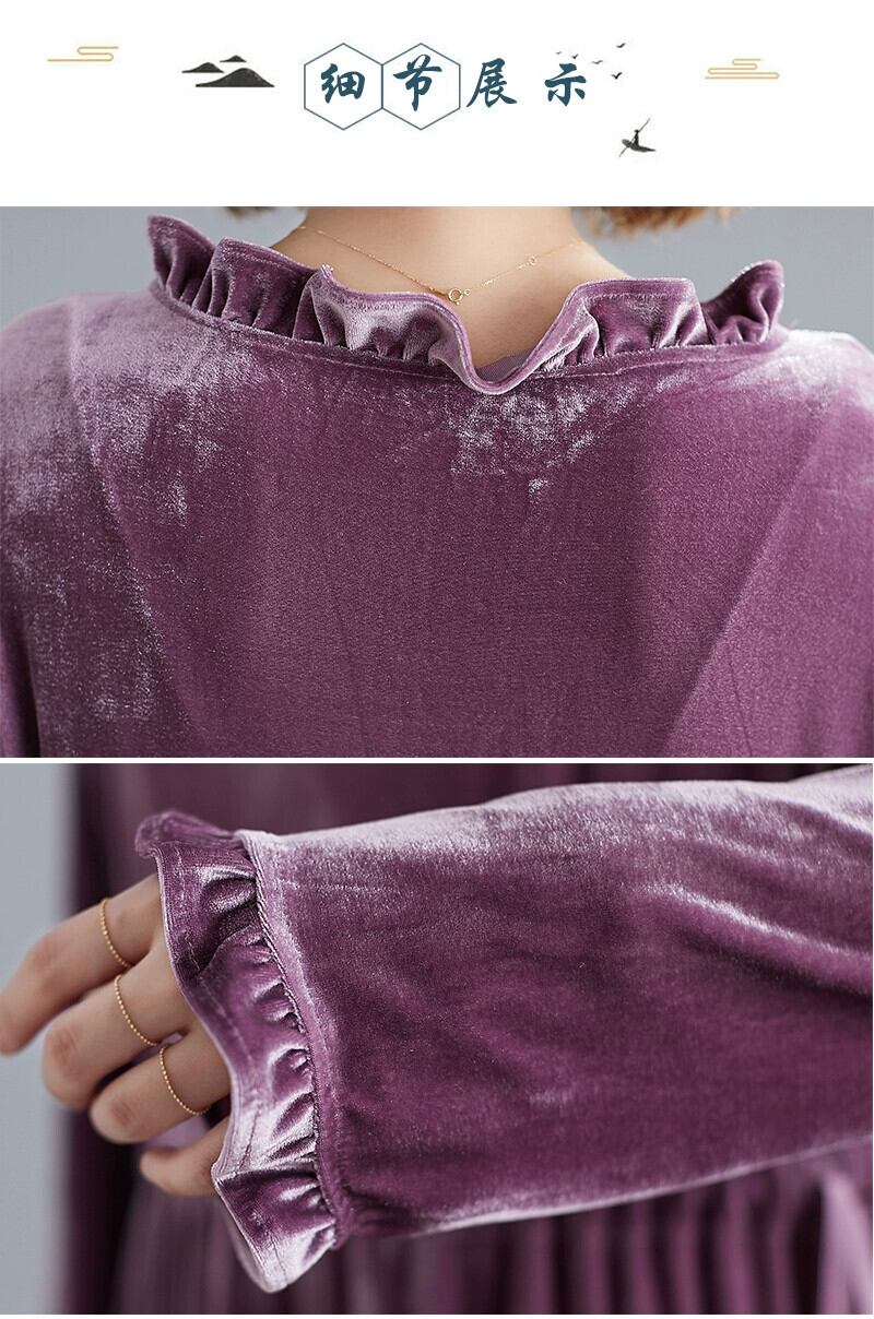レトロなプラスサイズの女性のベルベットのドレス春と秋の新しい緩いスプライシング腹カバー大きな裾紫色の長袖ミドル丈スカート ロング 大きめサイズ スプリング 春物 オータム 秋物 パープル sine9338131376