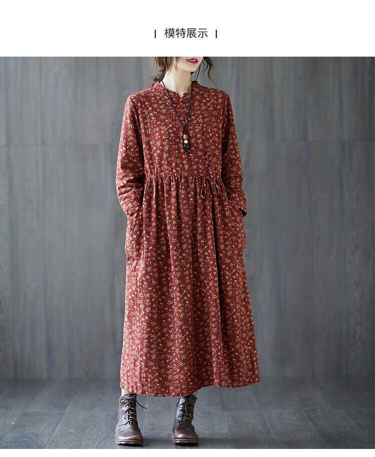 文学レトロな女性の綿とリネンのドレス春と秋のルーズ花柄シャツウエストカバーお腹長袖ミッドレングススカート ロング コットン スプリング 春物 オータム 秋物 sine98068241043