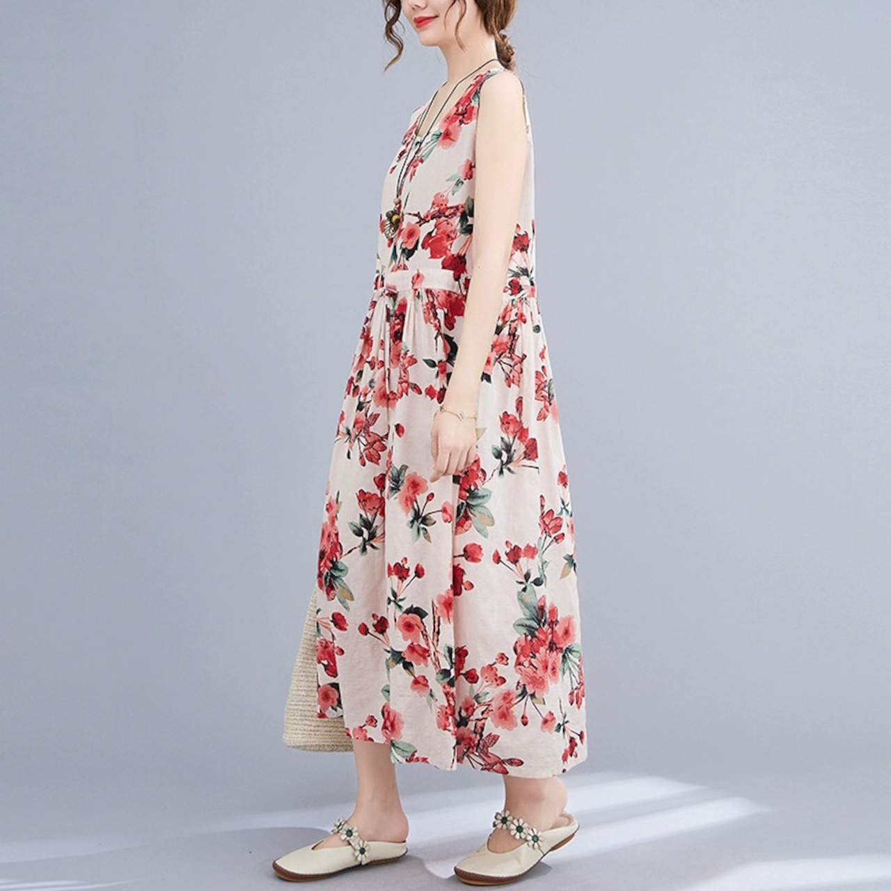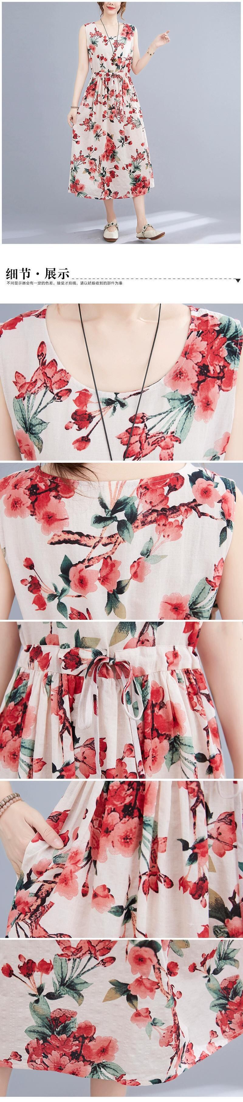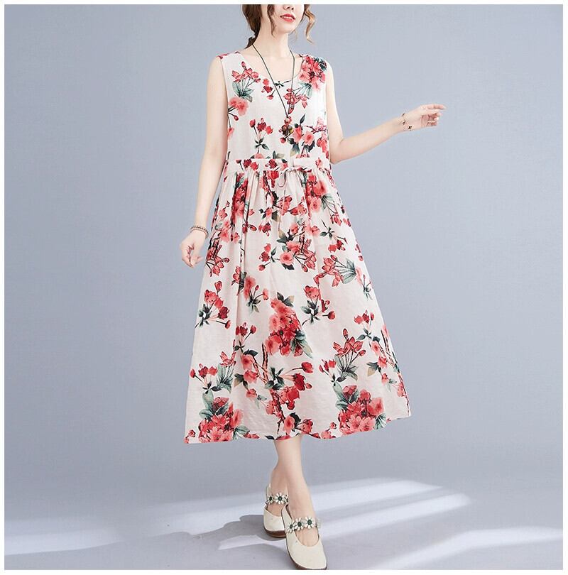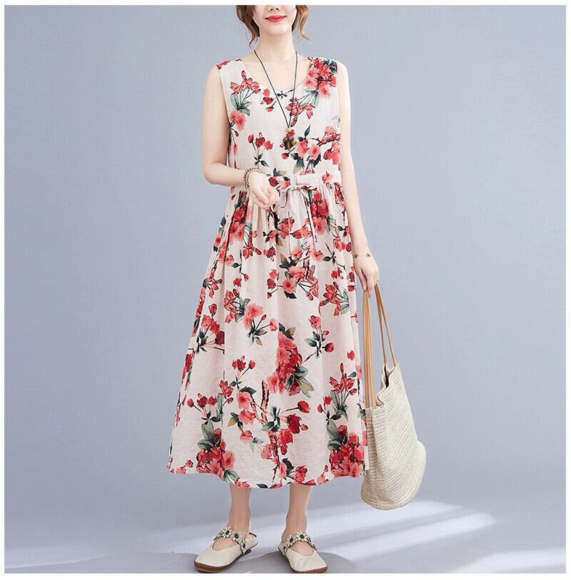 2021 新しい夏の綿とリネンのベストドレス緩い大きいサイズ年齢を軽減花柄レースアップウエストミッドレングス大きな裾スカート コットン 大きめサイズ サマー 夏物 sine75501046402