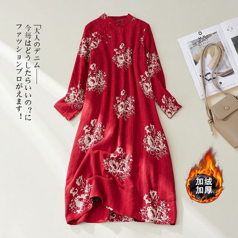 Eign Trade Export Big-name 割引婦人服中国風バックル改良チャイナドレスプラスベルベット厚みのあるプリントコットンとリネンのドレス冬 ウィンター 冬物 sine39644756235