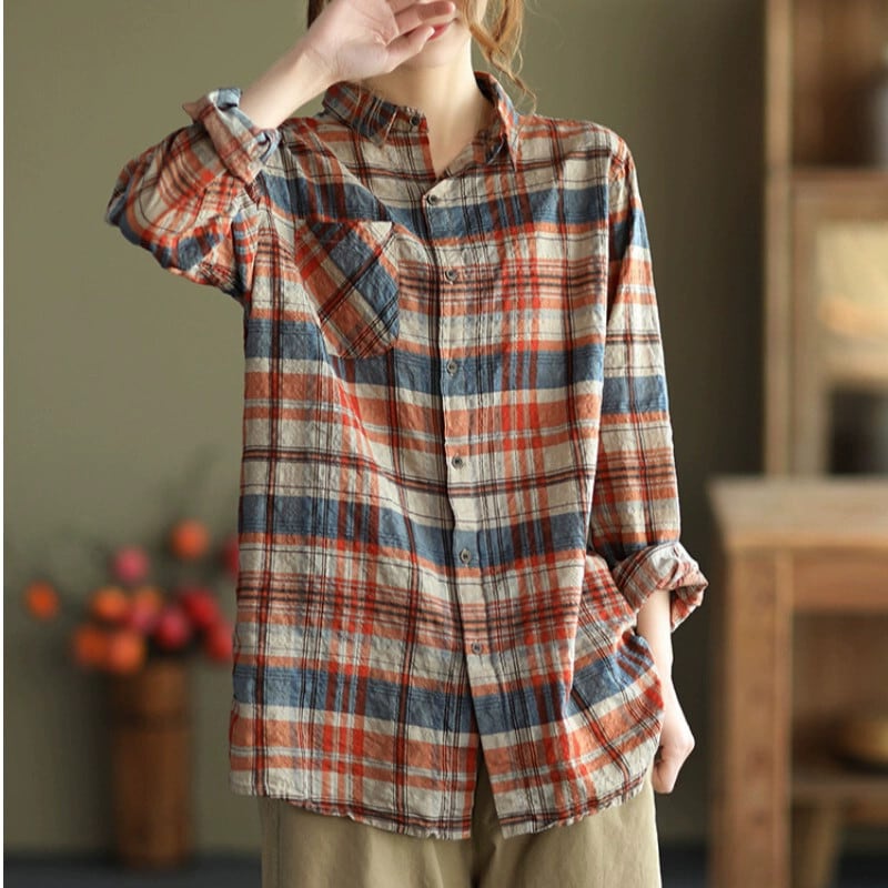 カウンタークリアランスクリアランスレディースラミーカーディガン長袖トップレトロチェック柄カジュアルコットンとリネンシャツ ロング sine30942744401