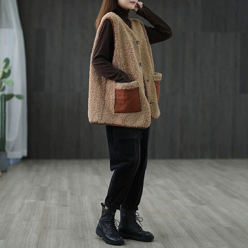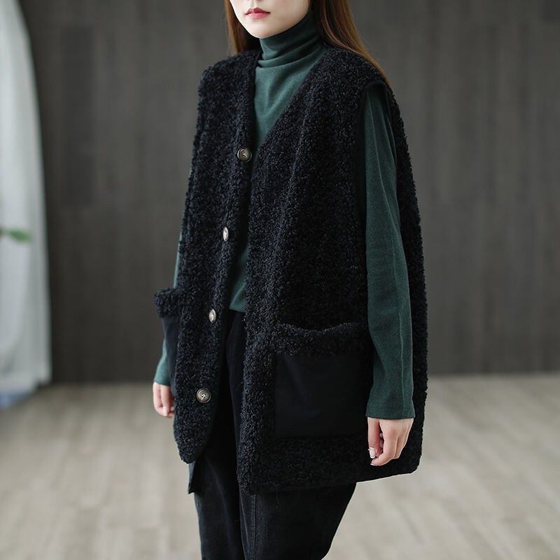 キャビネットのクリアランスピックアップと撤去 婦人服 レトロな大きなポケット Vネックの肥厚ベスト ベスト ルーズチョッキ ラムウールコート sine22407902110