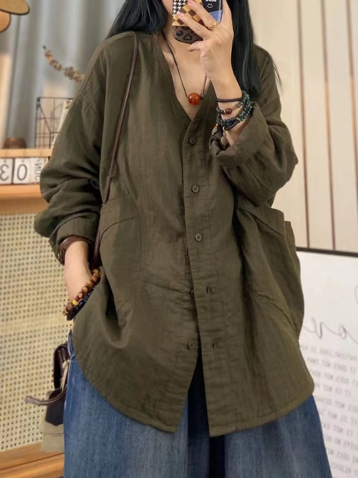 Eign Trade 輸出ブランドテールグッズレトロ二重層コットンとリネンシャツレディースルーズ大きいサイズ V ネックカーディガン長袖トップ秋 ロング 大きめサイズ オータム 秋物 Vネック sine69175974632