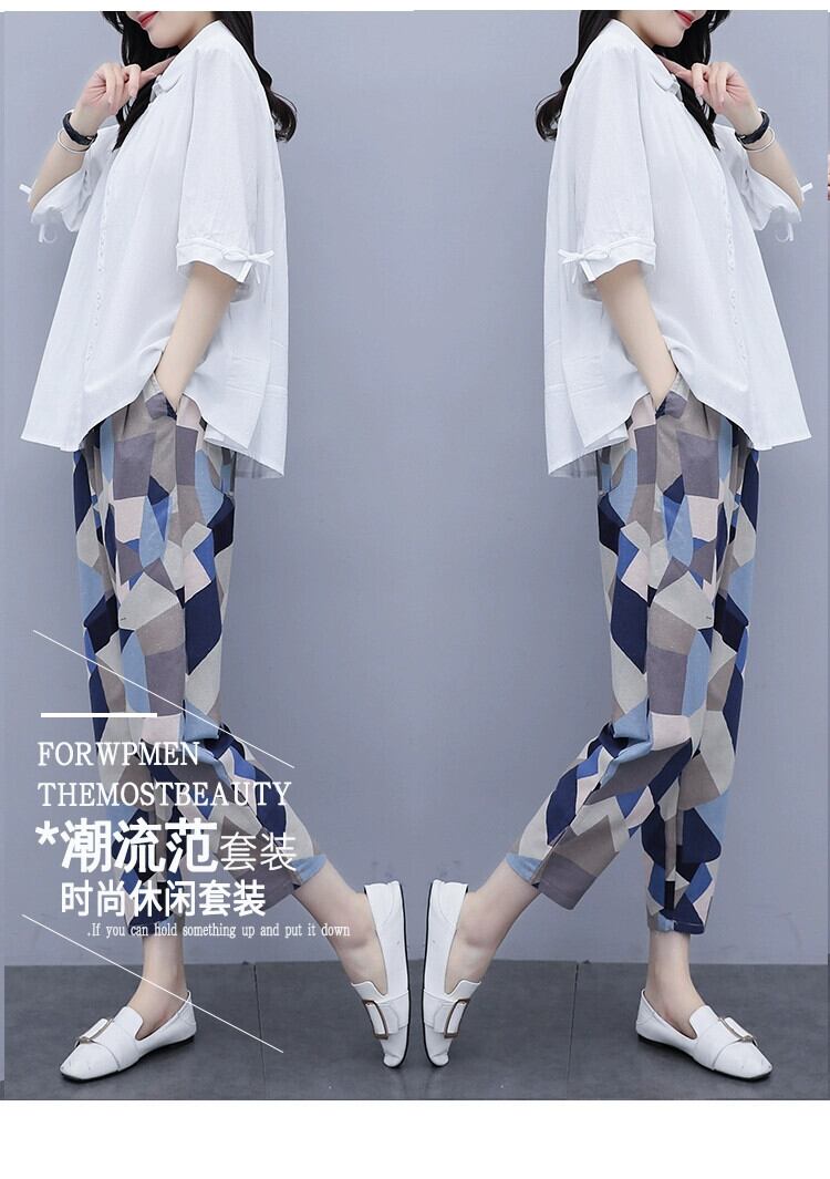 有能なコットンとリネンの女性用スーツ、夏の肌を覆う半袖シャツ、Tシャツトップ、カジュアルなプリントのハーレムパンツとリネンの2点セット サマー 夏物 sine22494847103