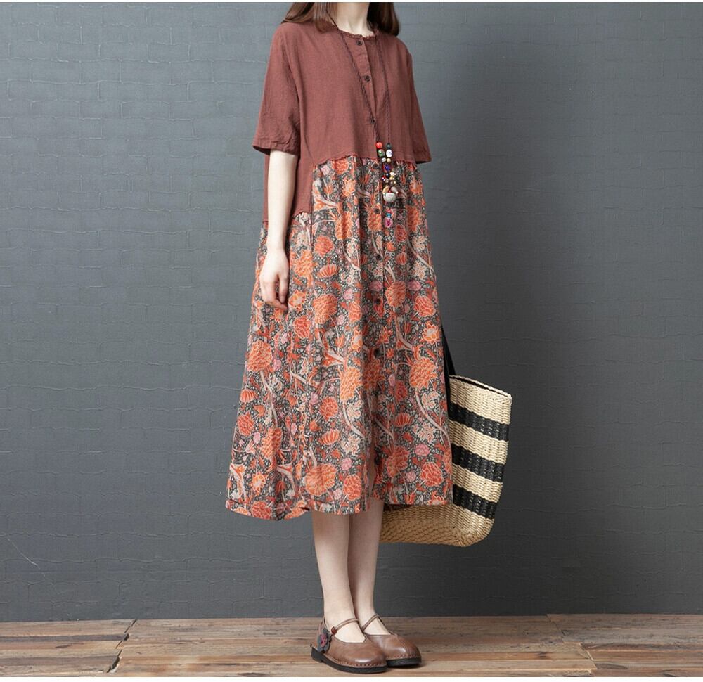 エスニックスタイルリネンドレスレディース夏ゆったり大きいサイズプリントコントラストパッチワークシャツ半袖コットンとリネンのミドル丈スカート 大きめサイズ サマー 夏物 sine120023406
