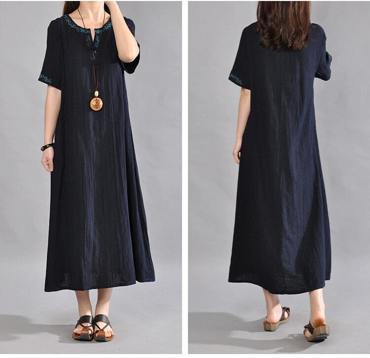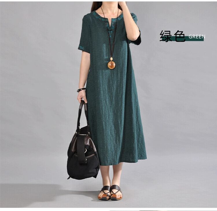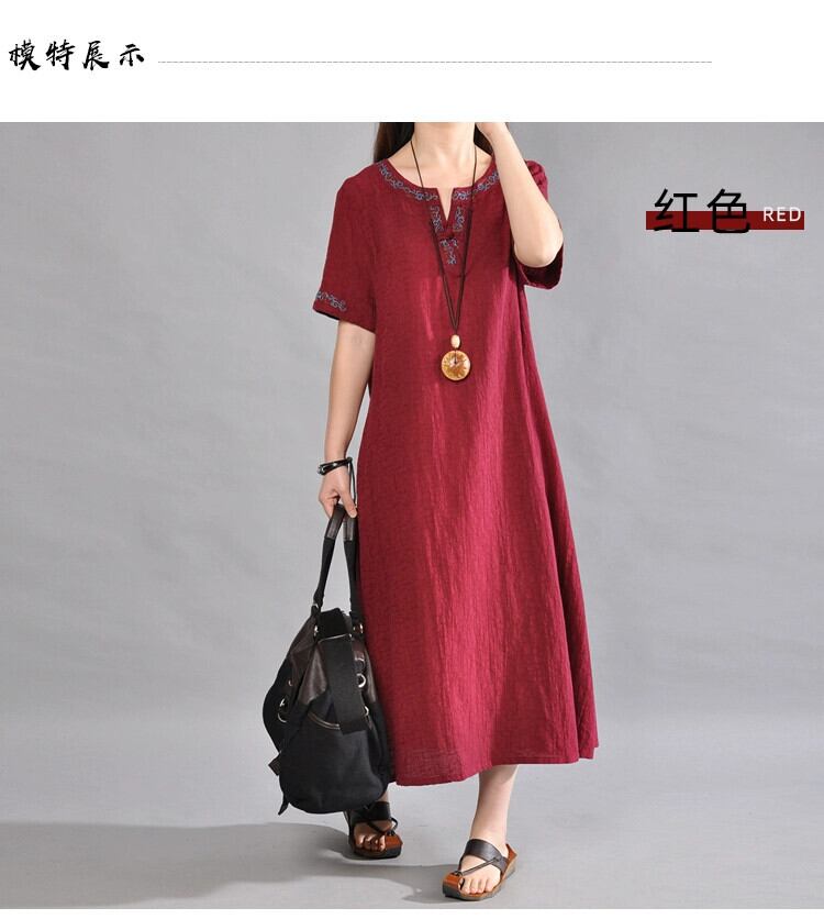 綿とリネンのドレス夏大きいサイズレトロ刺繍半袖文学ルーズローブロングスカート森エスニックスタイルリネンスカート レッド コットン 大きめサイズ サマー 夏物 sine55486555931