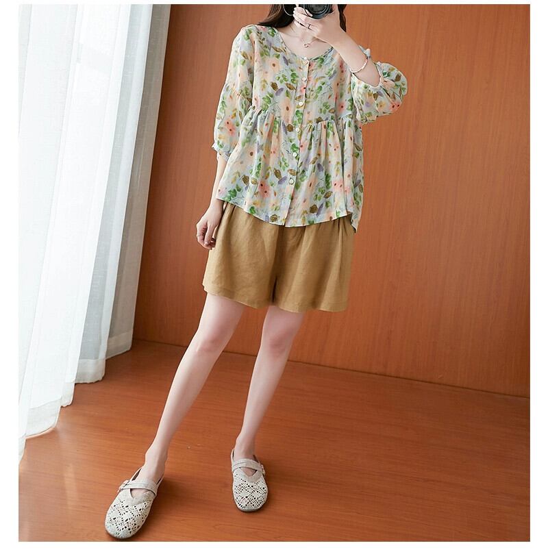 プラスサイズプラスサイズの女性の綿とリネンのシャツ Tシャツ夏ルーズカラー腹カバーカーディガンスリミング 5 分袖ドールシャツ コットン 大きめサイズ サマー 夏物 sine51026191673