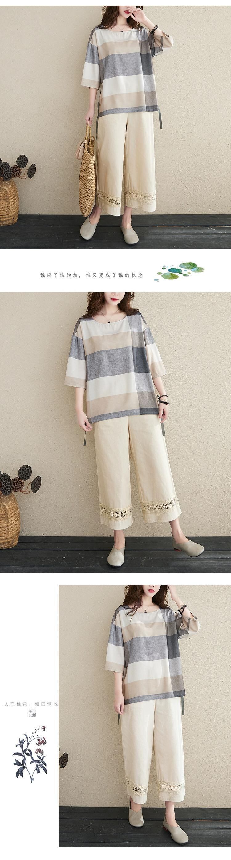 洋風綿麻スーツレディース、サマーストライプ七分袖Tシャツトップス、カジュアル9セントワイドパンツ、大きいサイズ2点セット コットン 大きめサイズ 夏物 sine47459848308
