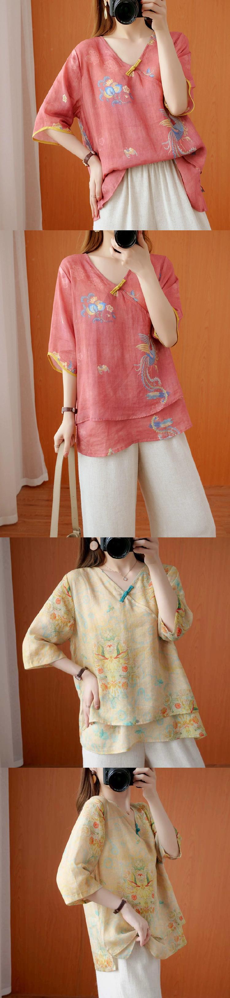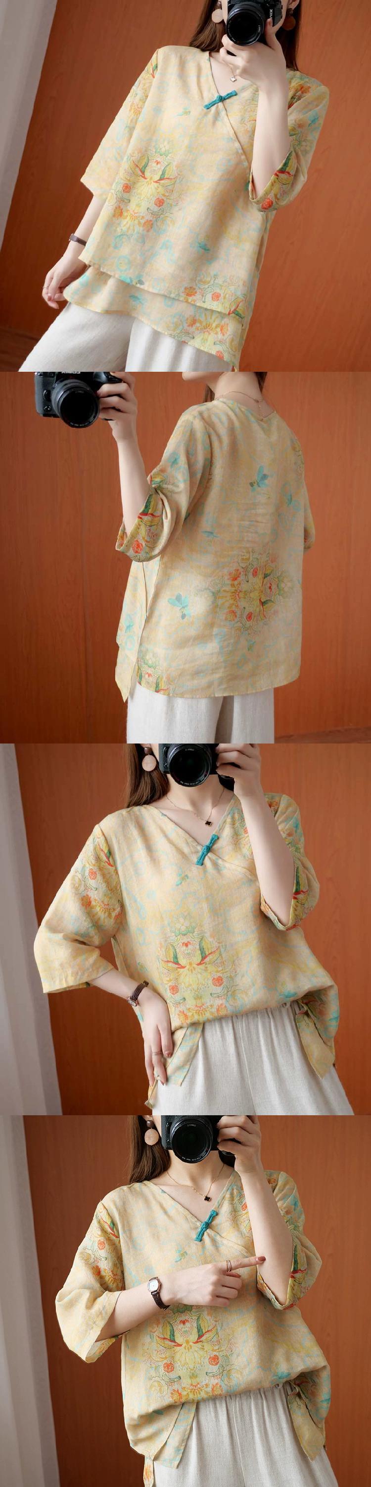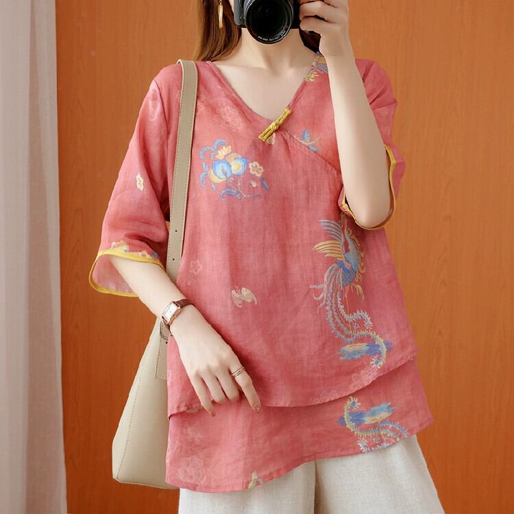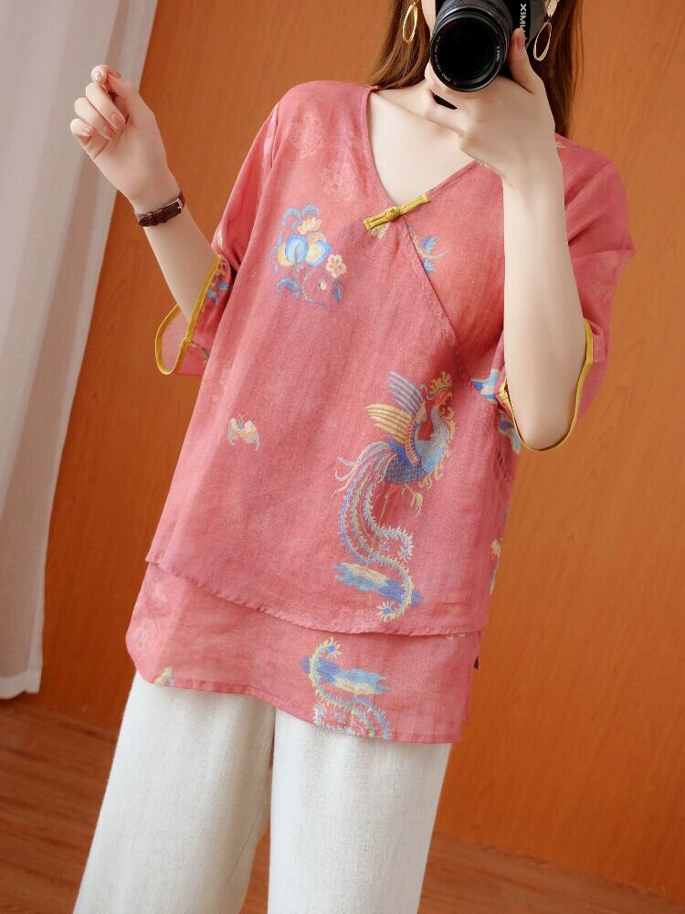 2021 新しい夏の綿とリネンシャツ女性ルーズ脂肪ミリメートル中国風ディスクボタン印刷大きいサイズの女性のラミー半袖トップス コットン 大きめサイズ サマー 夏物 sine3593818110
