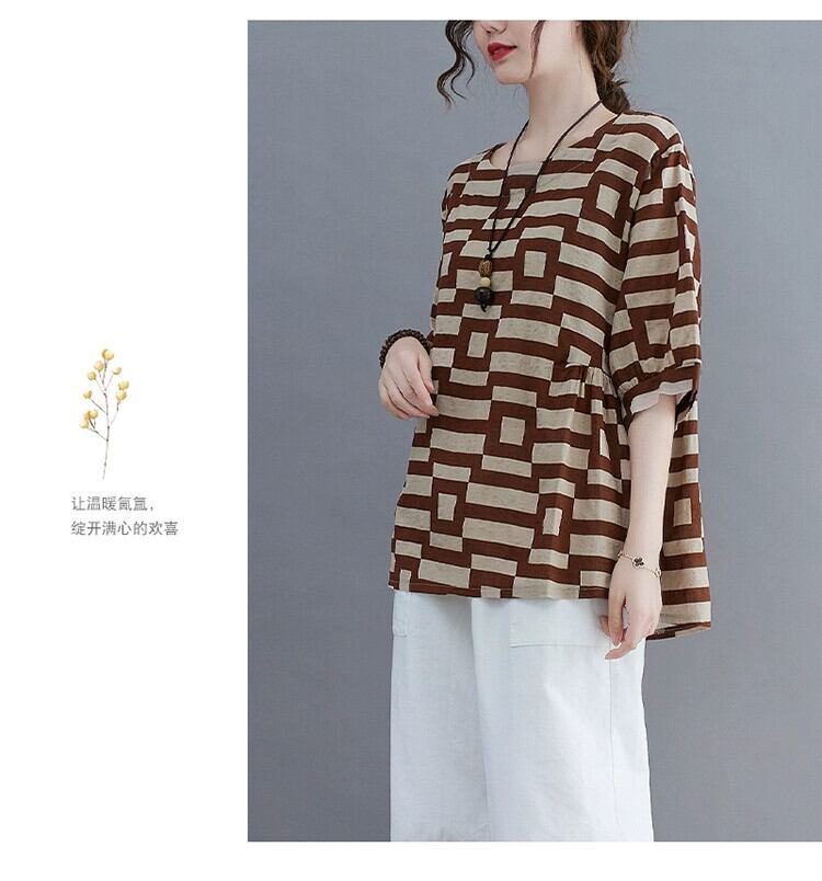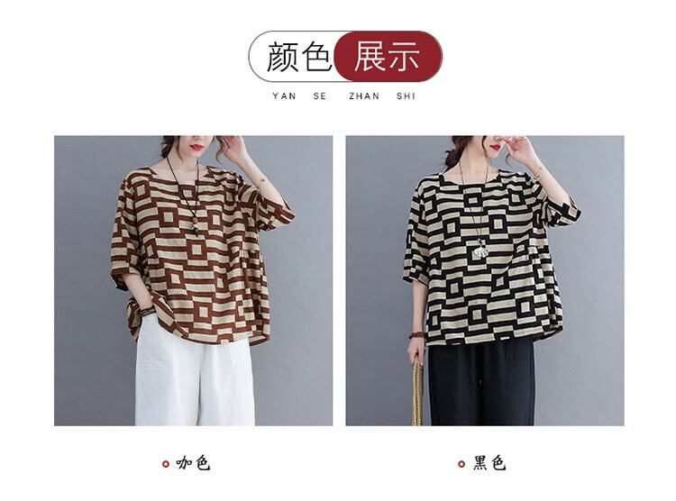 夏のコットンとリネンの半袖 T シャツ、脂肪、年齢を軽減するプリント、スリム、プラスサイズの女性のお腹をカバーするトップス 大きめサイズ サマー 夏物 Tシャツ sine532105741