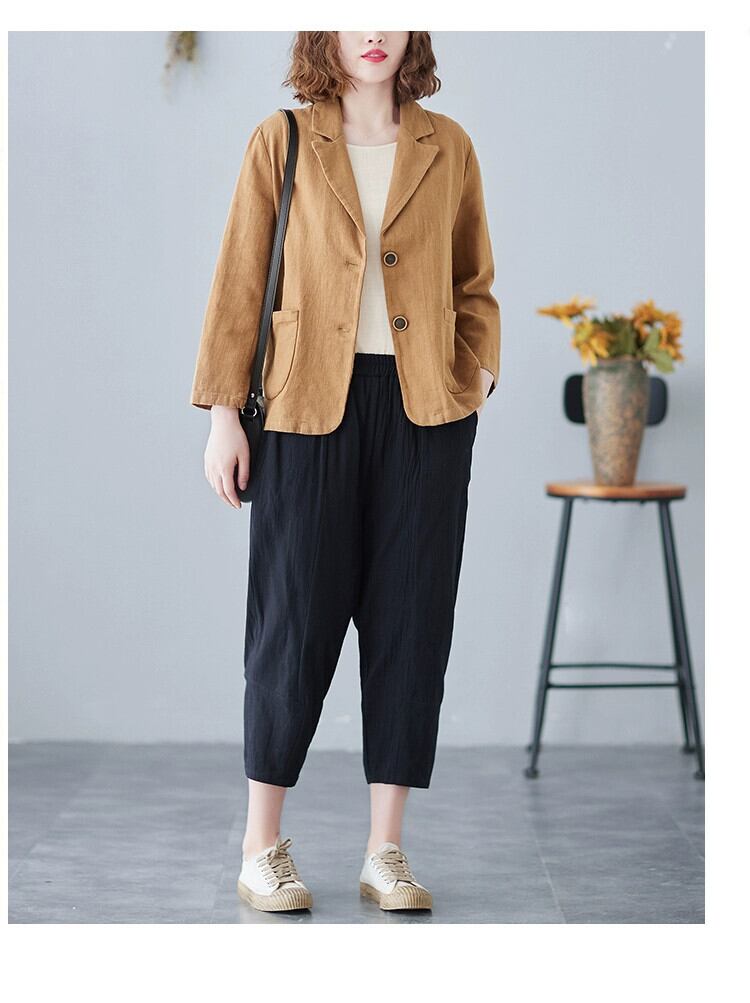 年齢を軽減するプラスサイズの女性の綿とリネンのスーツジャケット春と秋の新しいルーズソリッドカラーラペルお腹カバーカジュアルカーディガントップ コットン 大きめサイズ スプリング 春物 オータム 秋物 sine98061103094