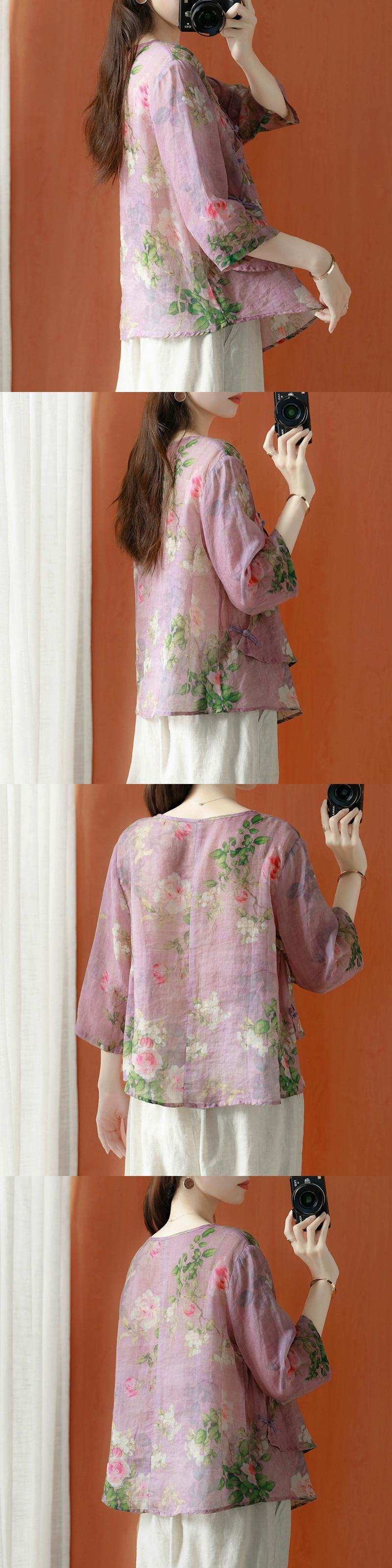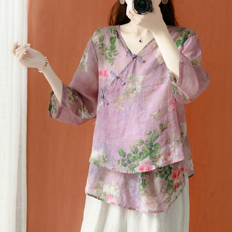 日焼け止めシャツトップ女性の夏ルース文学レトロバックル V ネックスプライシング痩身七分袖シャツプラスサイズの婦人服 大きめサイズ サマー 夏物 Vネック sine4584629463