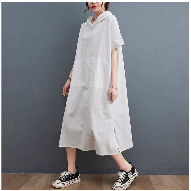 220 キャティーズプラスサイズの女性の夏の新しいスタイルルーズダブルポケット怠惰なスタイルミッドレングスフード付き無地半袖ドレス 大きめサイズ サマー 夏物 ソリッドカラー sine55117484678