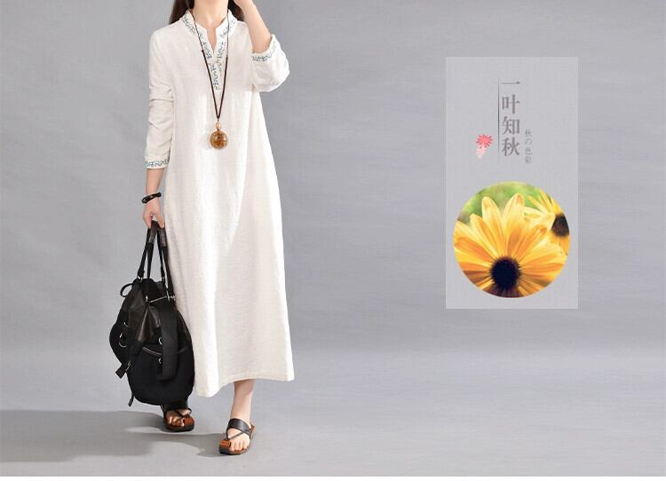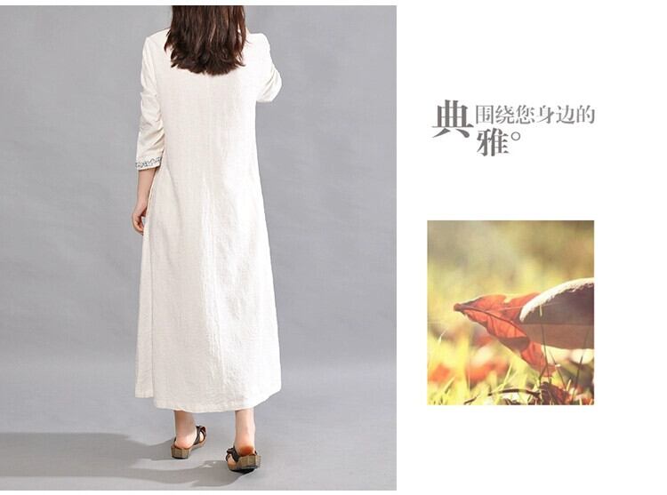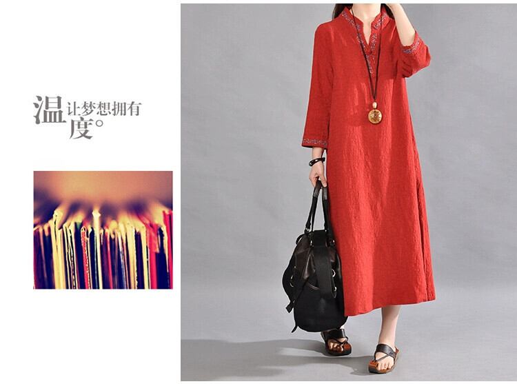 綿とリネンのドレスの女性の春と秋の新しい緩い大きいサイズ刺繍エストスタイルレトロエスニックスタイル長袖リネンミドル丈スカート ロング レッド コットン 大きめサイズ スプリング 春物 オータム 秋物 sine2822500710