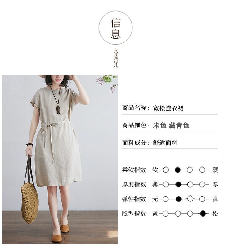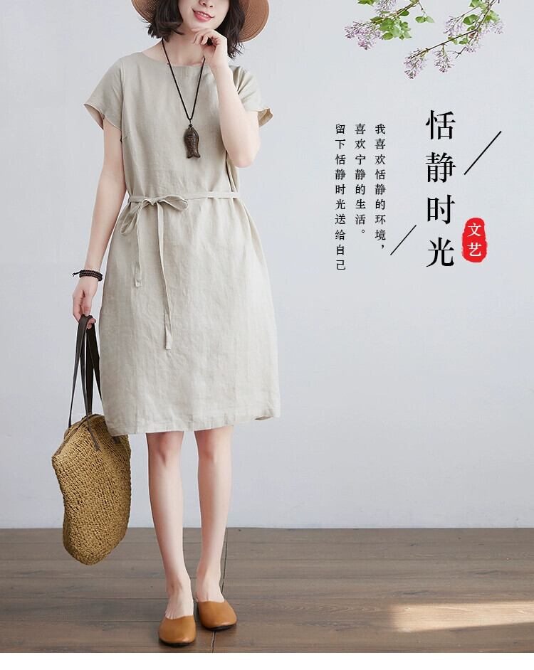 夏の新しいプラスサイズの女性のルーズ文学ソリッドカラーレースアップウエストミッドレングス半袖aラインコットンとリネンのドレス 大きめサイズ サマー 夏物 sine40633133745