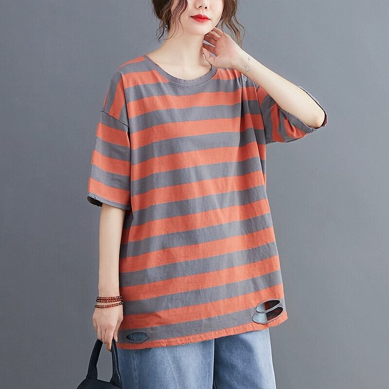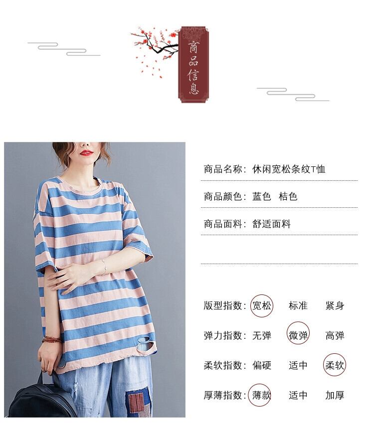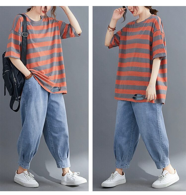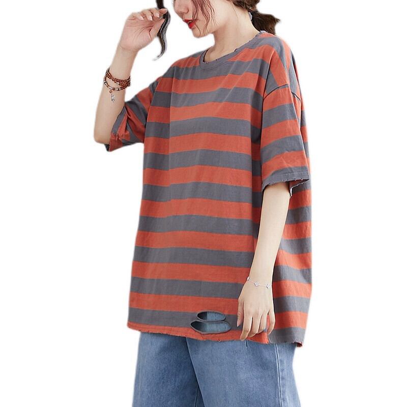 破れた半袖 Tシャツの女性の夏 2021 新しいルーズファットシスターストライプ対照的な色 200 ポンド大きいサイズの女性の年齢を減らすトップス 大きめサイズ サマー 夏物 sine82559186982