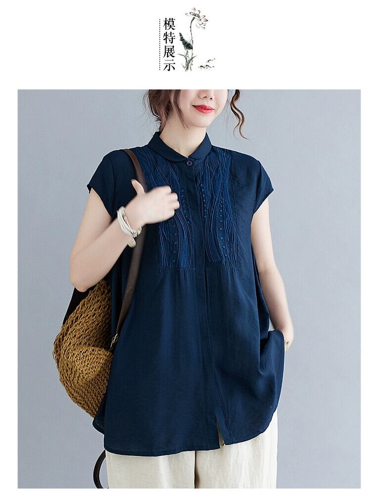 2021 夏の綿とリネンシャツルーズ脂肪ミリメートル文学刺繍スタンドカラー痩身半袖トップス大きいサイズの女性の ショート コットン ハーフスリーブ 大きめサイズ サマー 夏物 sine66444429648