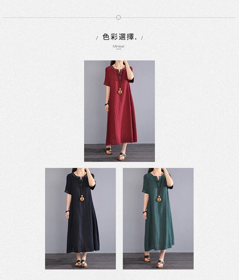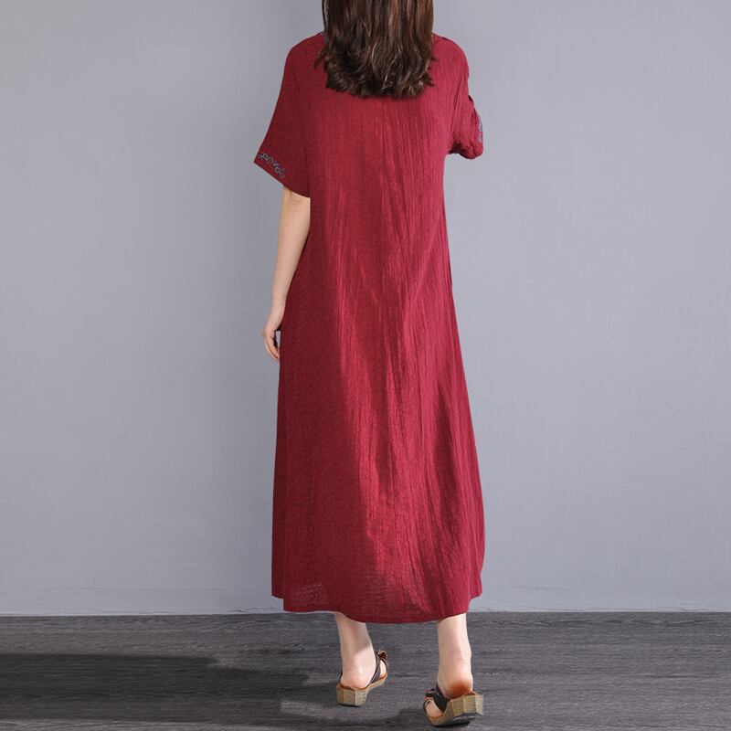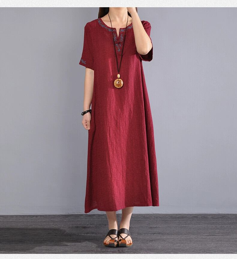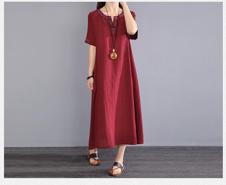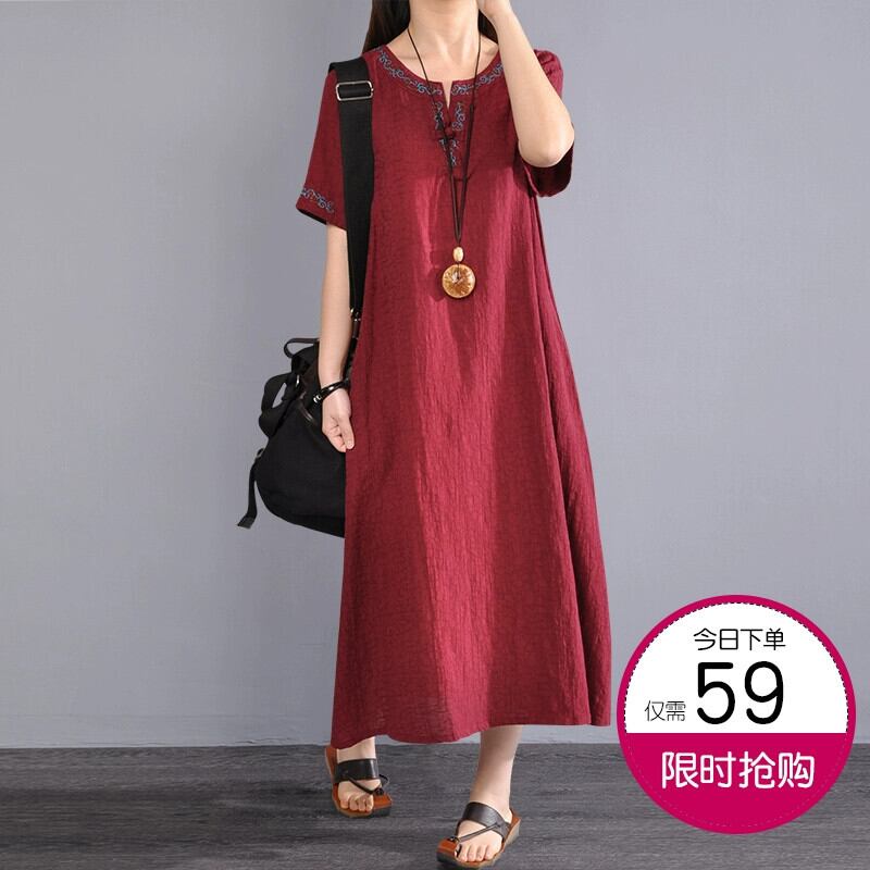 コットンとリネンのドレスの女性、ゆったりとした大きいサイズ、太いmm、森の女性のローブ、刺繍入りのディスクバックル、レトロなリネンエスニックスタイルのミドル丈スカート レッド 大きめサイズ sine60056327878