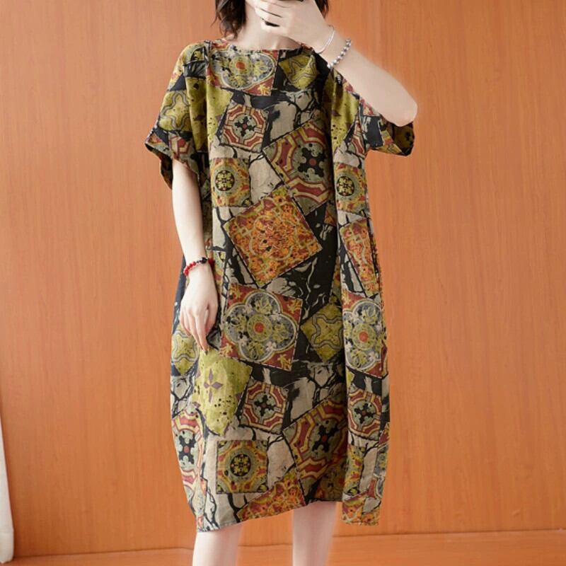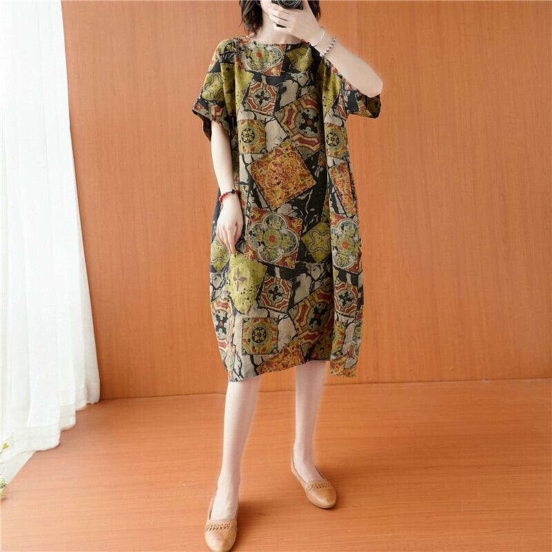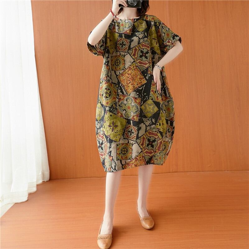 200 ポンドのレトロなプラスサイズの女性の 2021 年夏新しいルーズ プリント繭型腹カバー ミッドレングスの綿とリネンのドレス コットン 大きめサイズ サマー 夏物 sine47445798783