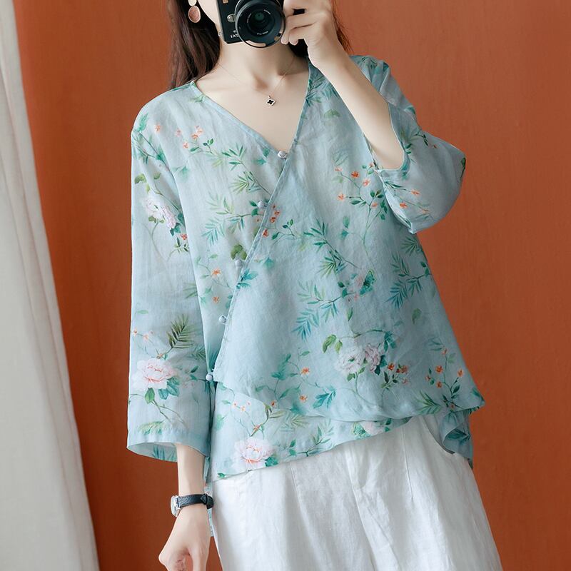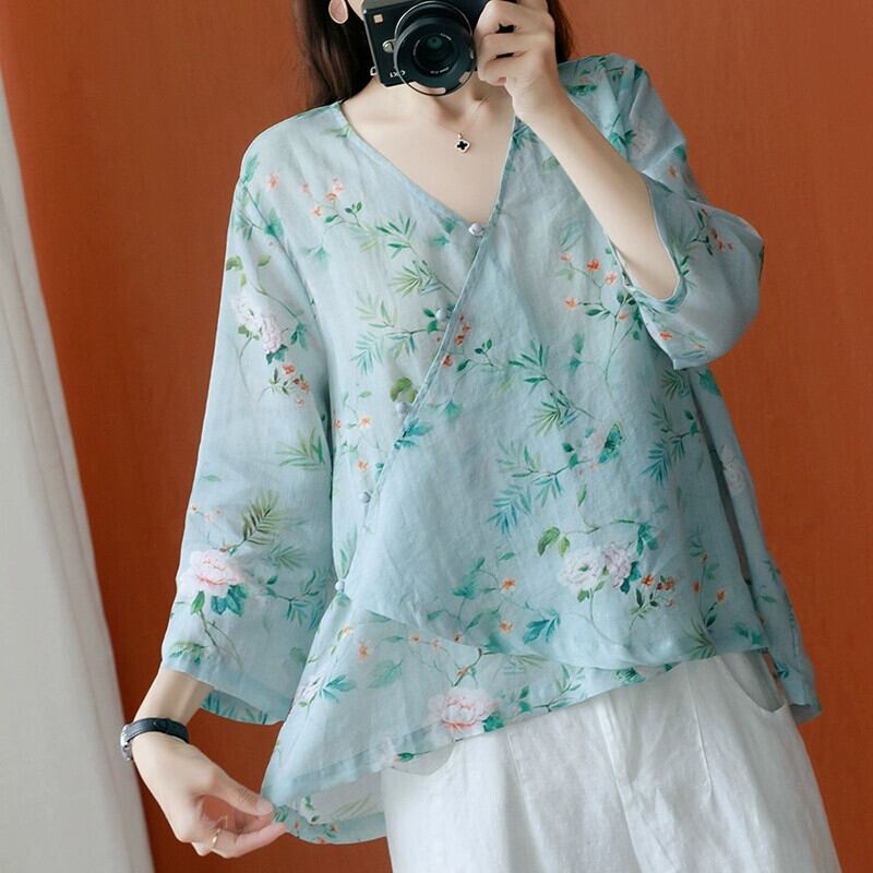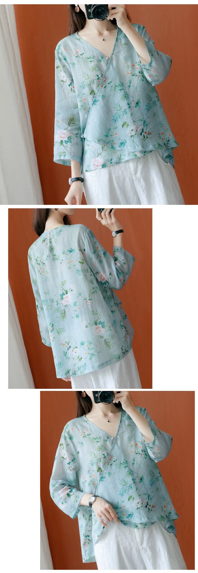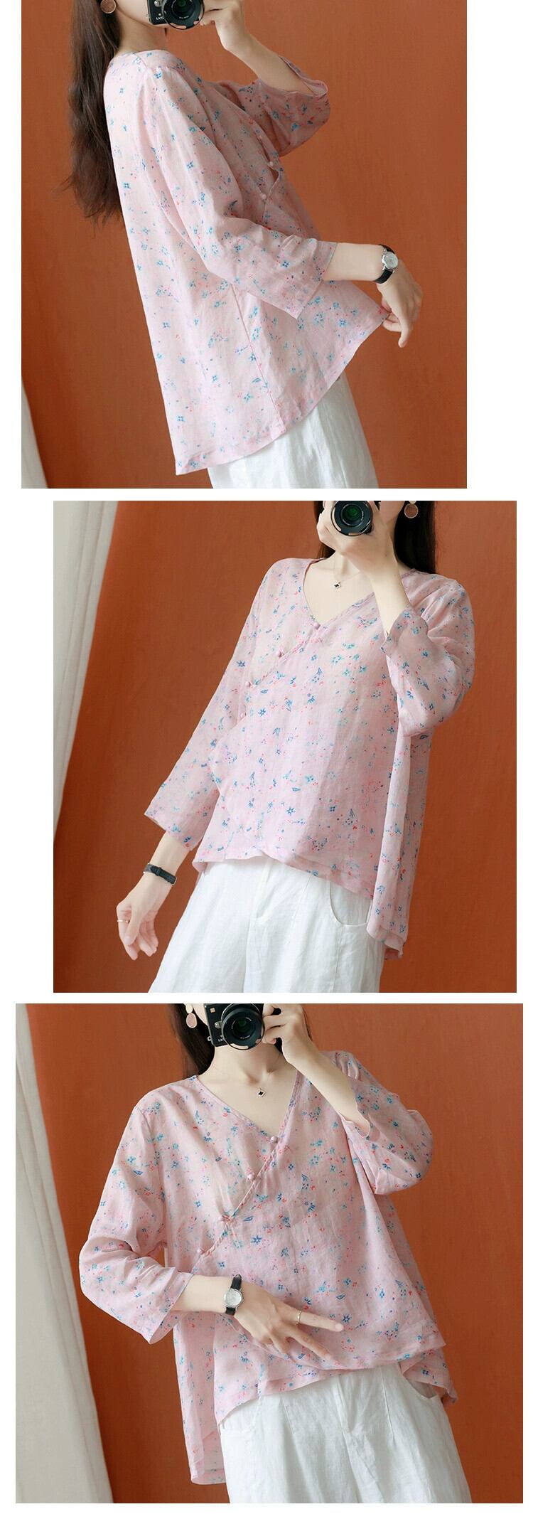 プラスサイズのレディースコットンとリネンシャツトップス夏新のルーズでウエスタンスタイルのVネックで肉を隠し、スリムなパターンを見せます薄い日焼け止めシャツTシャツ 大きめサイズ sine73943221524