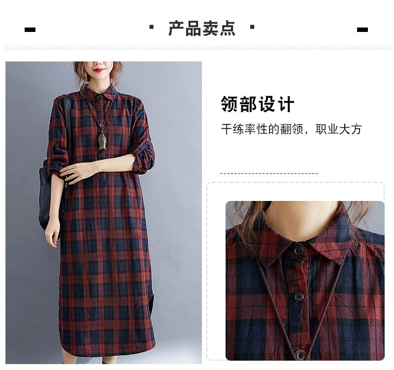 レトロプラスサイズの女性の長袖ドレス春と秋の新しい緩い年齢を軽減するチェック柄ラペル膝丈カジュアルミドル丈スカート ロング 大きめサイズ スプリング 春物 オータム 秋物 sine73052598514