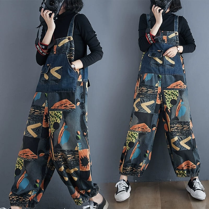 大きいサイズの女性のデニムオーバーオール春と秋のバージョンの新しい緩い老化を軽減するプリント股スリムカジュアルブルマー 大きめサイズ スプリング 春物 オータム 秋物 ショーツ sine71594108206