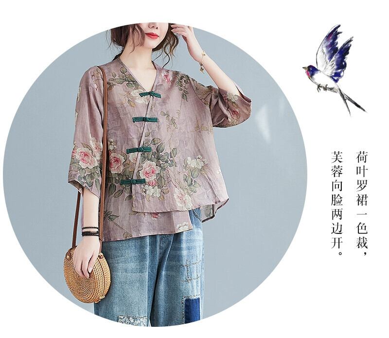 非対称シャツトップス女性の夏の新 2022 ルーズでスタイリッシュなディスクボタン V ネック花柄コットンとリネン Tシャツ女性プラスサイズ 大きめサイズ サマー 夏物 Vネック sine10543640698