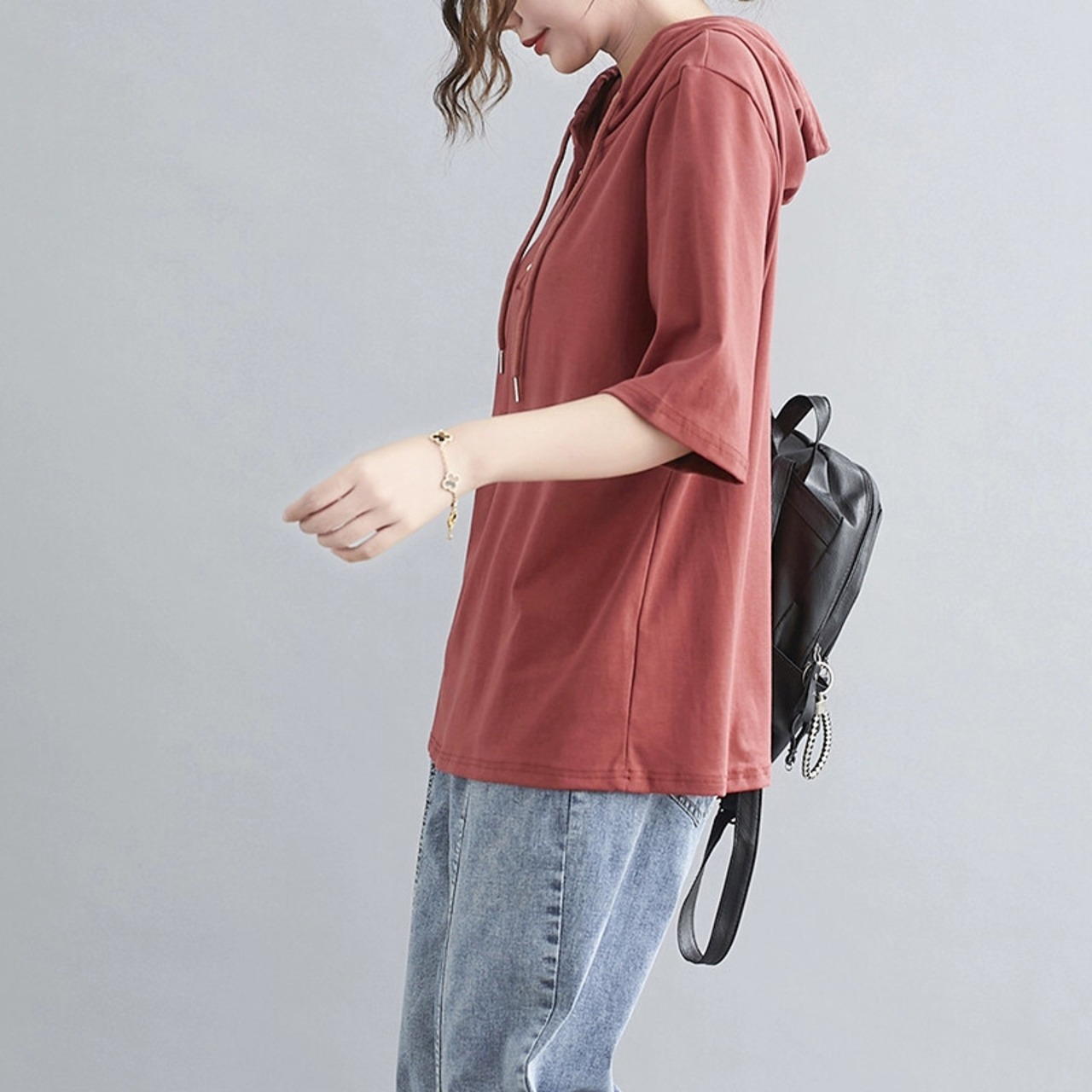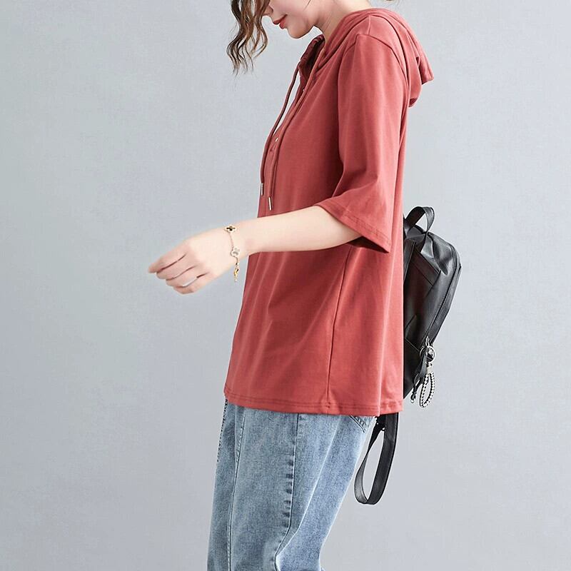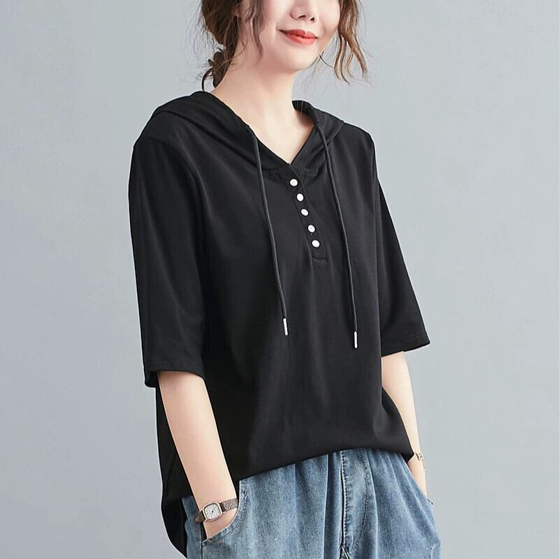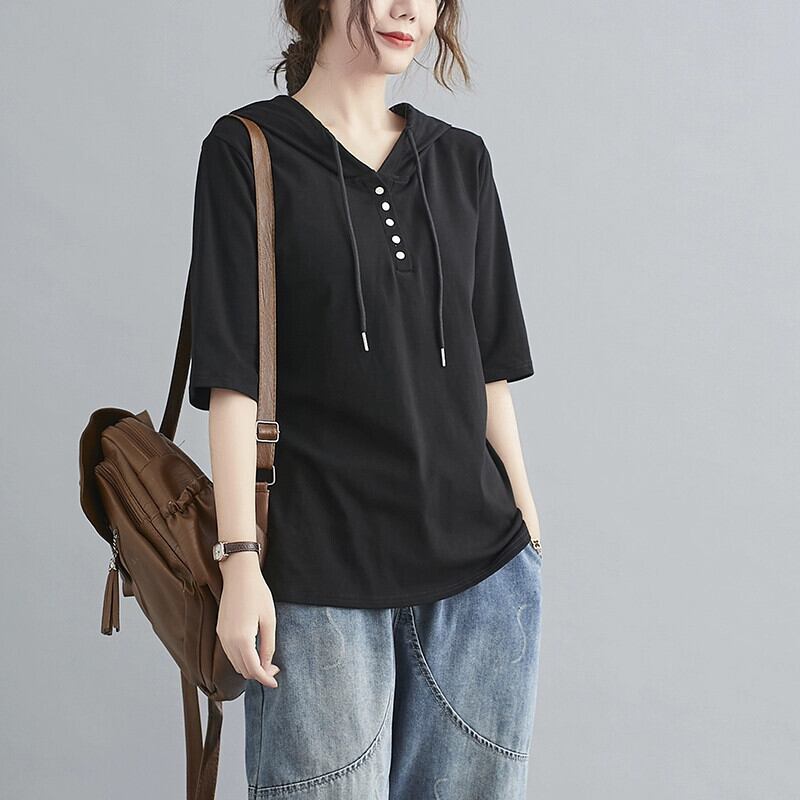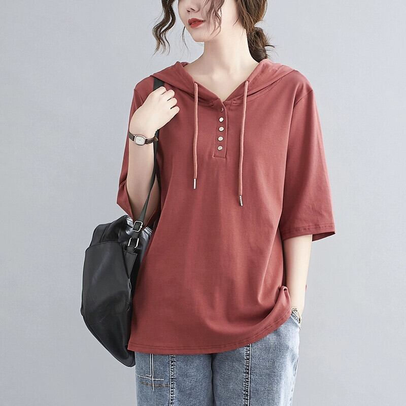 ボタン無地フード付きトップ女性の夏ルーズプラスサイズ女性の 200 キャティーズ巾着腹カバー文学カジュアル半袖 Tシャツ 大きめサイズ サマー 夏物 ソリッドカラー sine62177782803