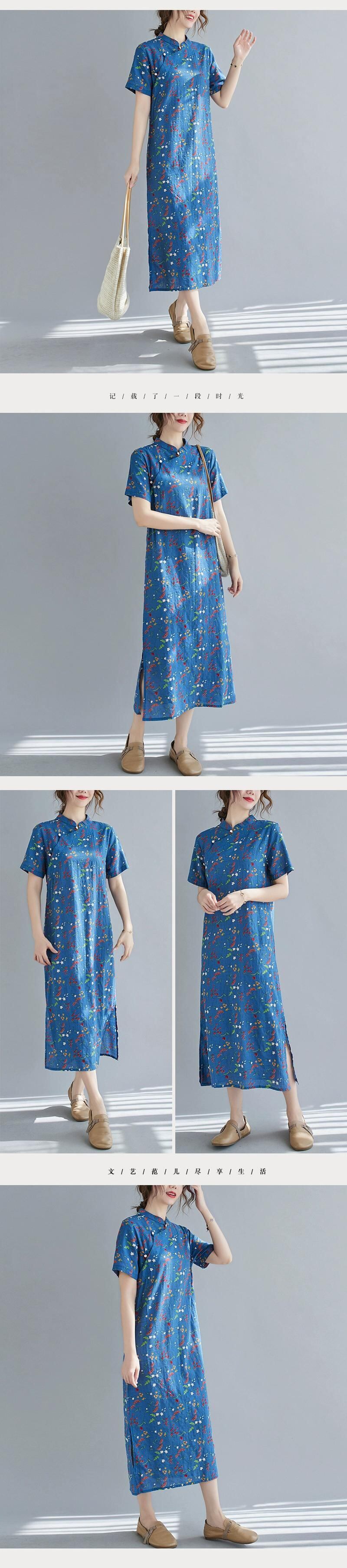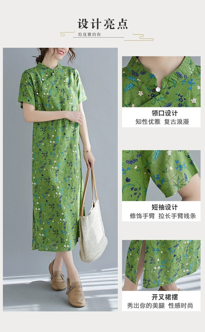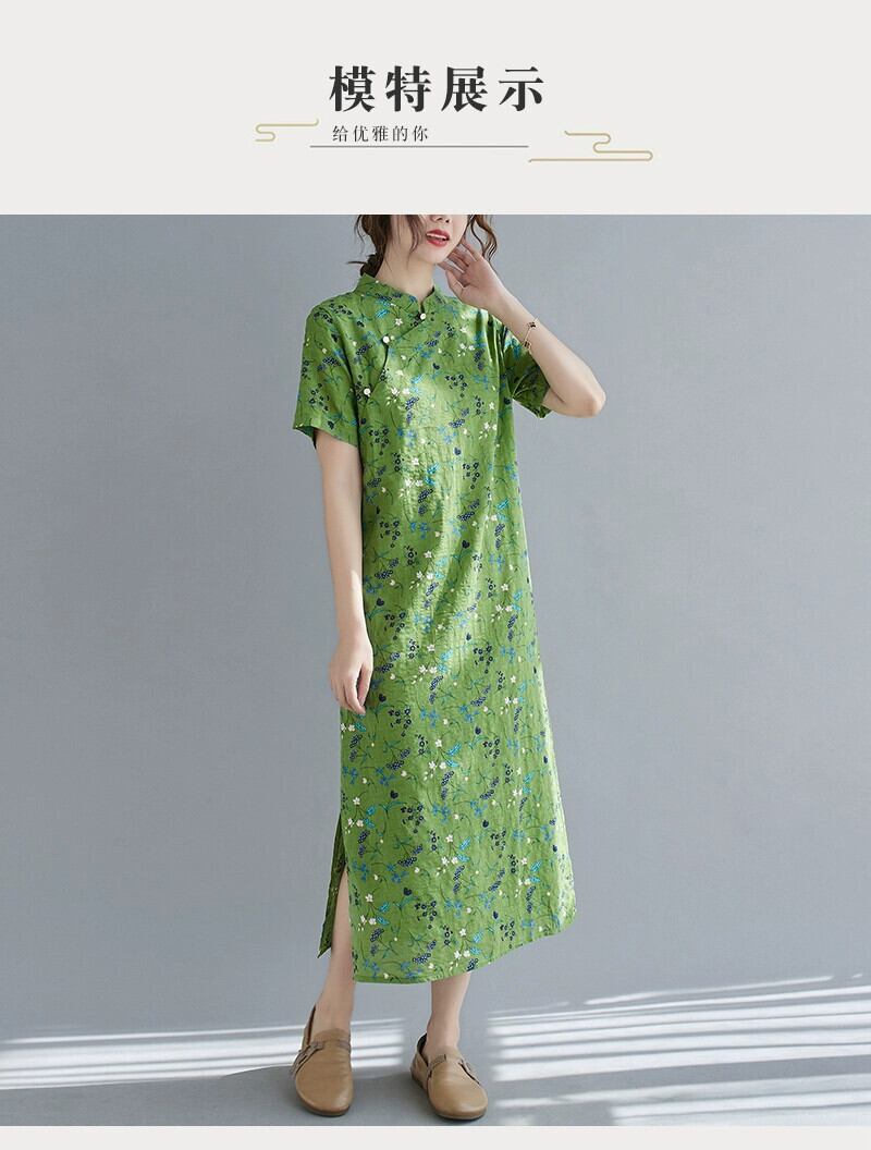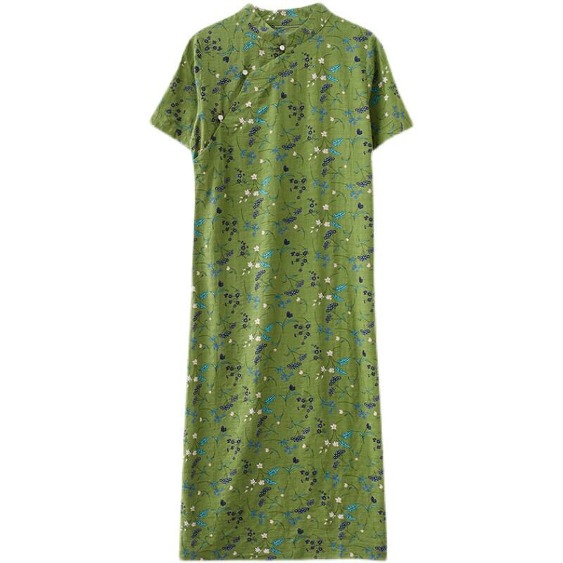 綿とリネンの中国チャイナドレスの女性 2021 夏大きいサイズ花柄中国風プリント西洋スタイルリネンミドル丈スカート コットン 大きめサイズ サマー 夏物 sine97804012858