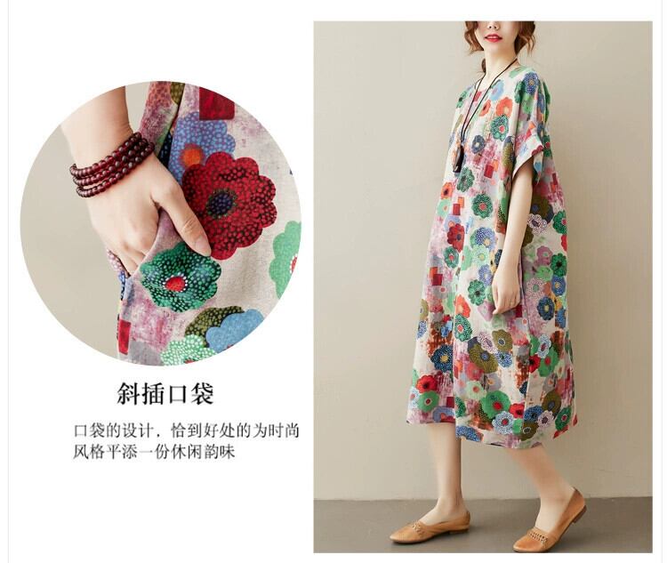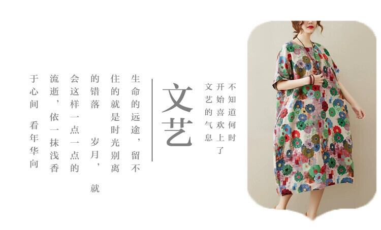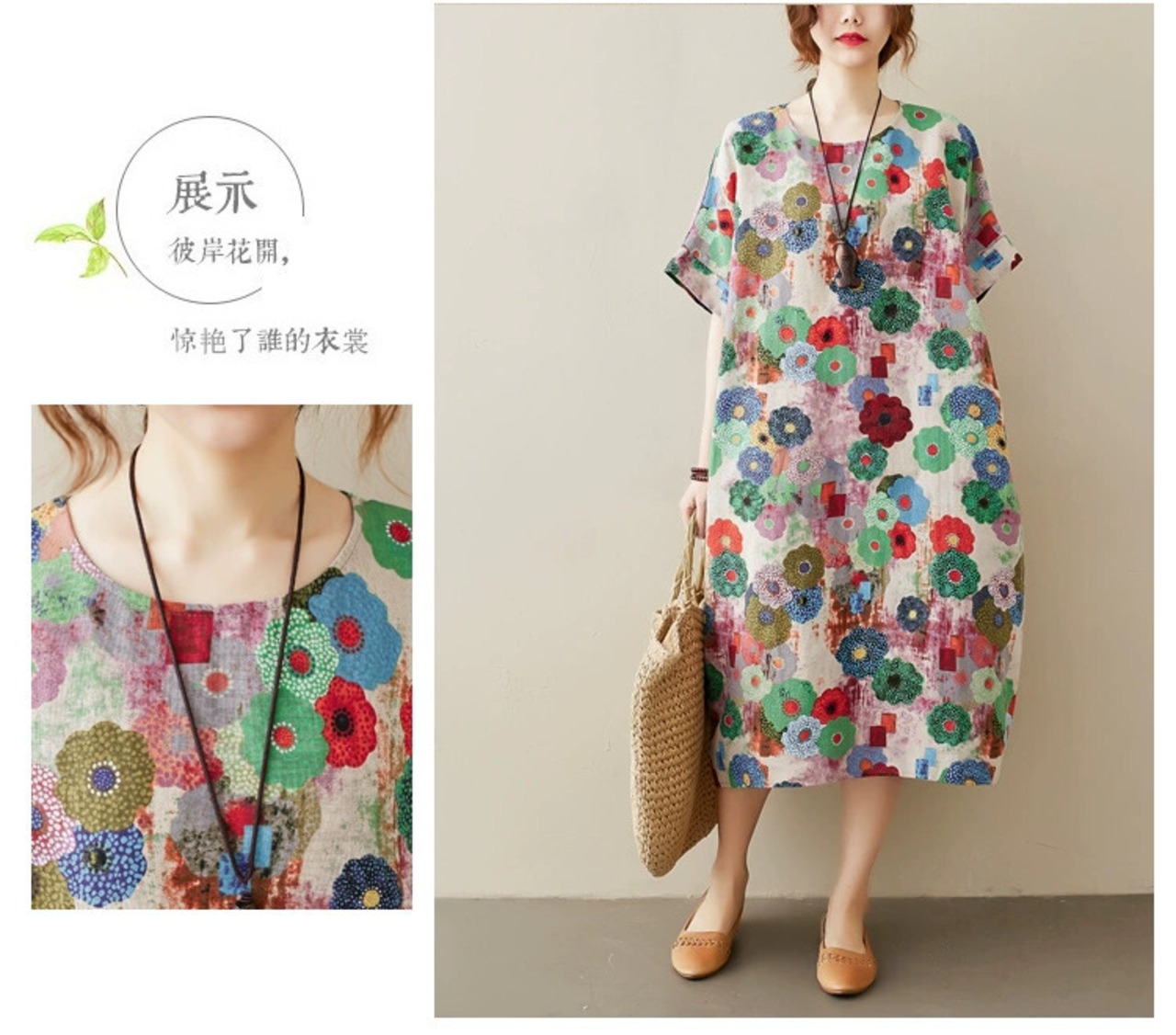 ファットシスターコットンとリネンドレスサマースタイルルーズ年齢軽減カラー腹カバーミッドレングスプラスサイズレディース半袖aラインスカート 大きめサイズ 夏物 sine51071934785