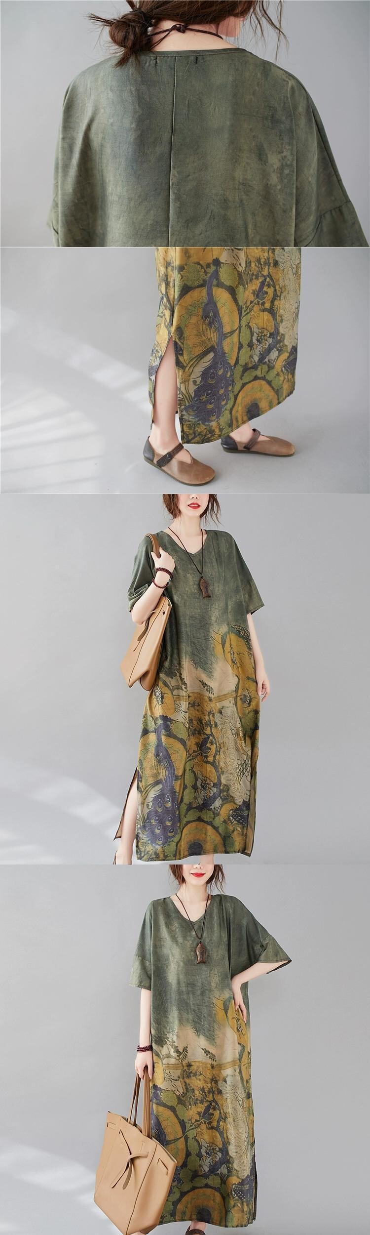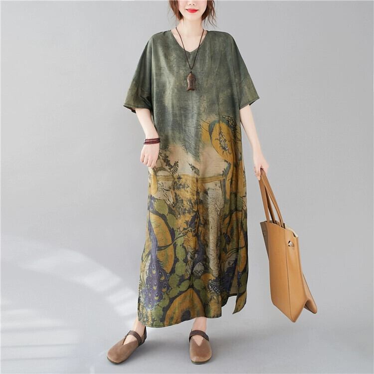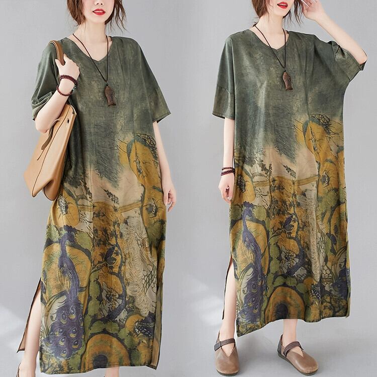 太った人のおしゃれなお腹カバー夏ルーズVネックサイドスリットロングスカートプラスサイズレディースプリント痩身半袖ドレス 大きめサイズ サマー 夏物 sine65895532865