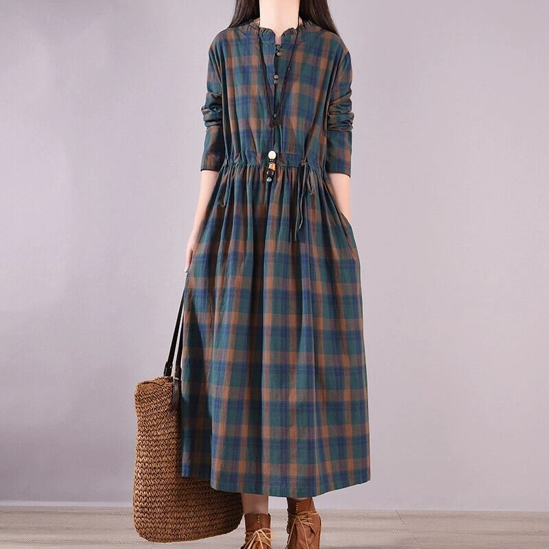 クリアランスカウンター最後の在庫レディースレトロコットンとリネンチェック柄ドレスルーズスリミングレースアップリネンロングスカート sine80518639640