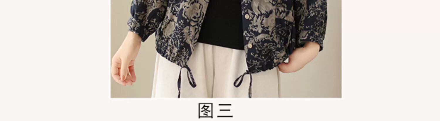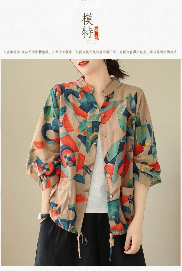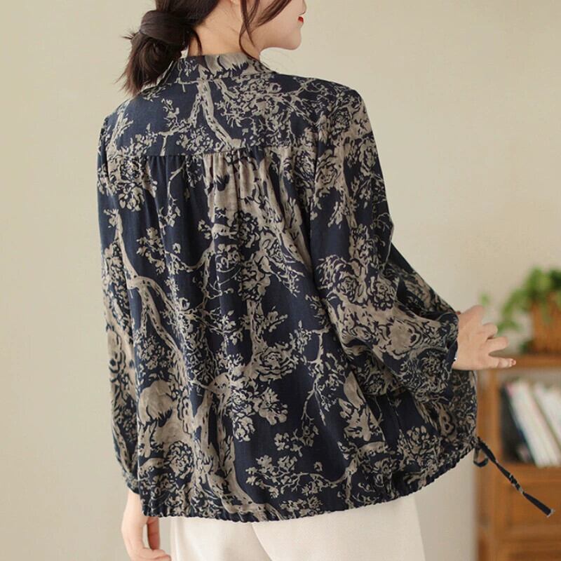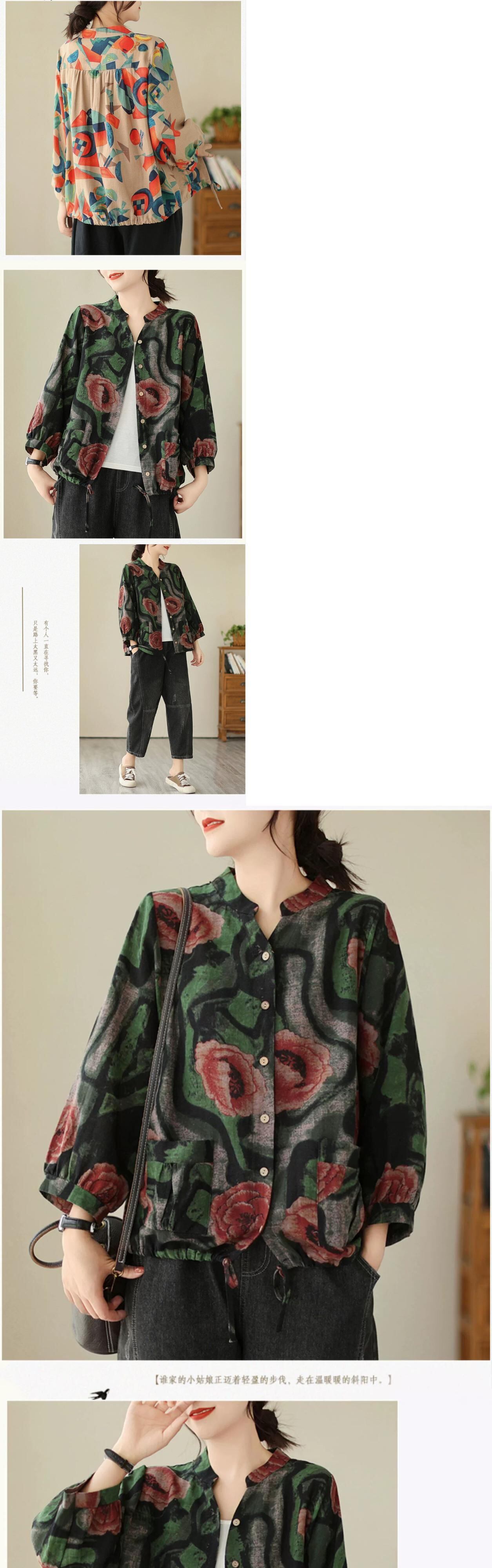 Eign Trade ディスカウント ブランド テール グッズ 年齢を軽減するプリント コットンとリネン シャツ レディース ルーズ ヘム ドローストリング リネン スタンドカラー トップ 秋 オータム 秋物 sine97747614039