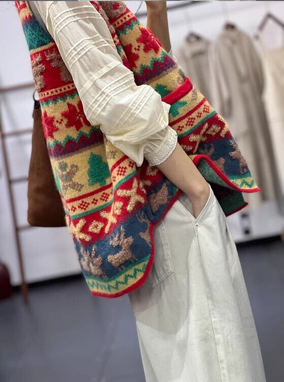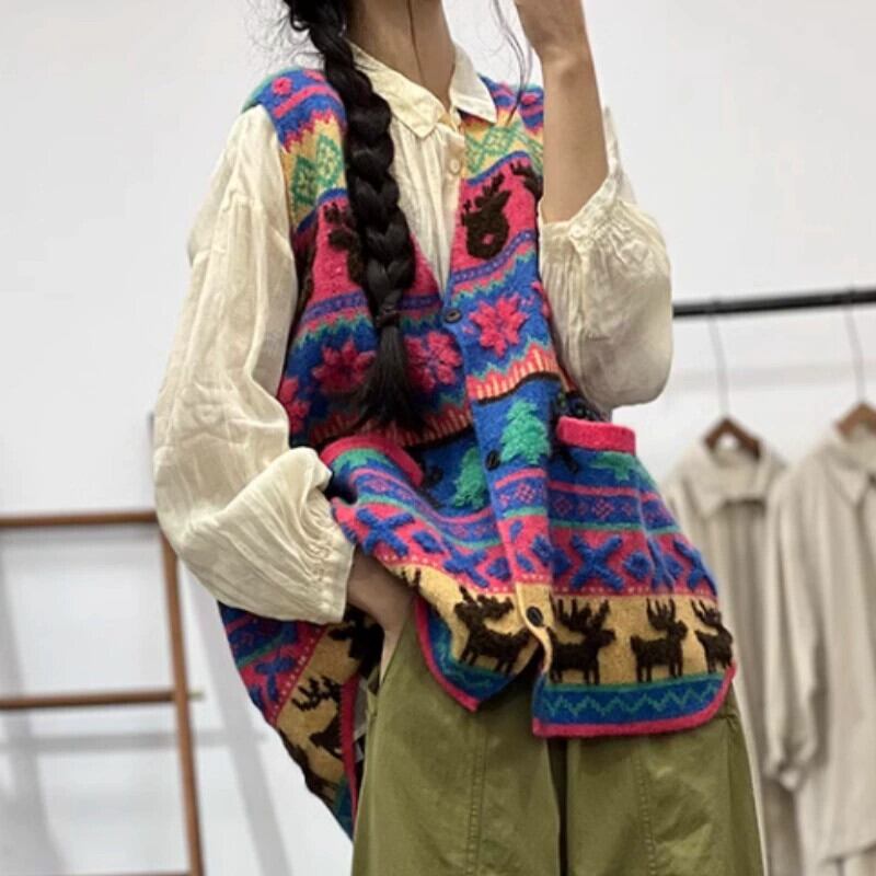 クリアランスリーク〜 ese オリジナルレトロプリントニットベスト女性ルーズ V ネックチョッキベストセーター冬 ウィンター 冬物 Vネック sine46560747774