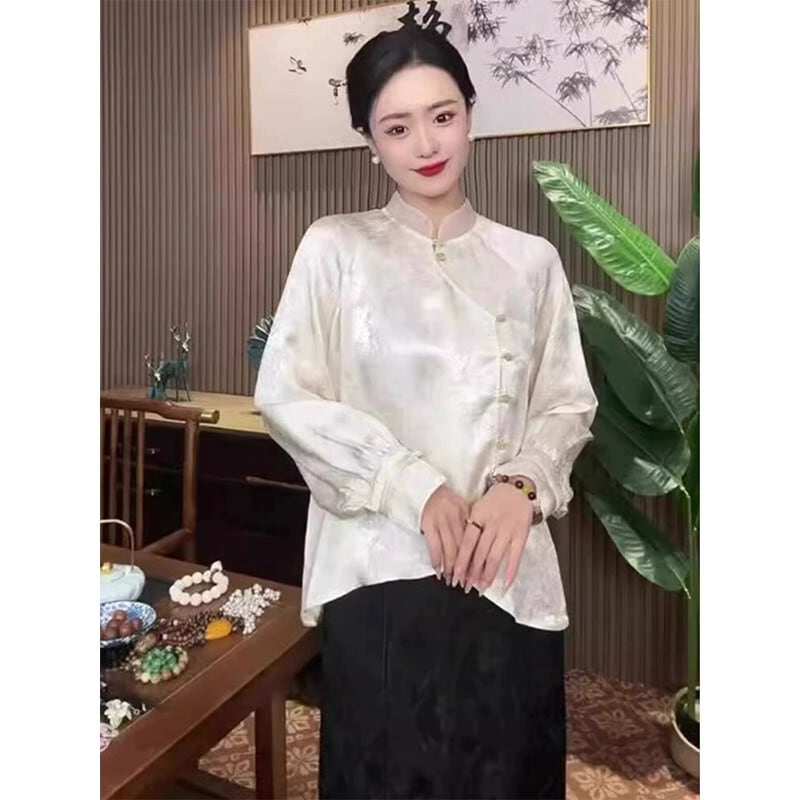 中国風のアセテートサテンシャツ女性の春と秋の新国民風のハイエンドジャカードディスクボタンスタンドカラー唐スーツトップ スプリング 春物 オータム 秋物 sine84061392489