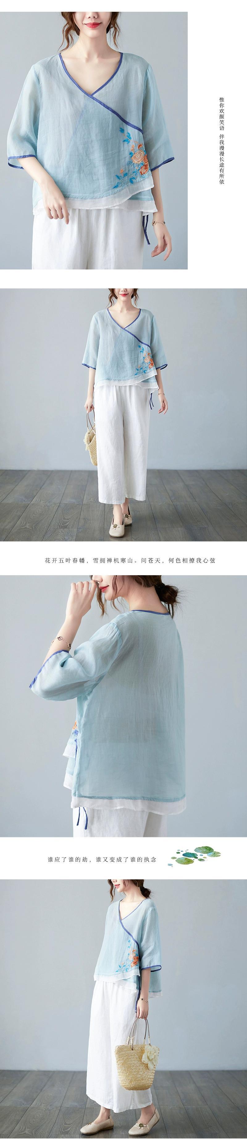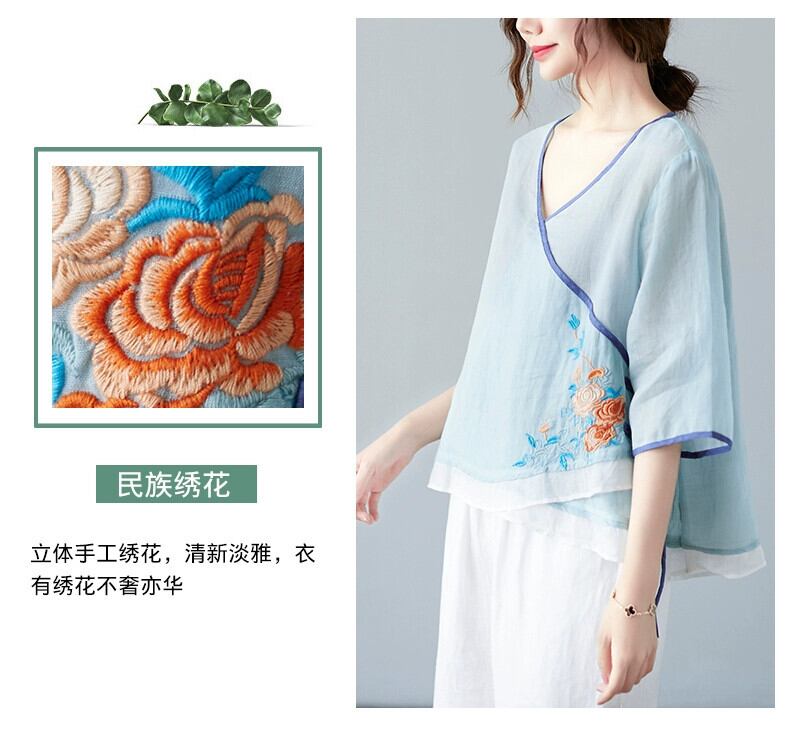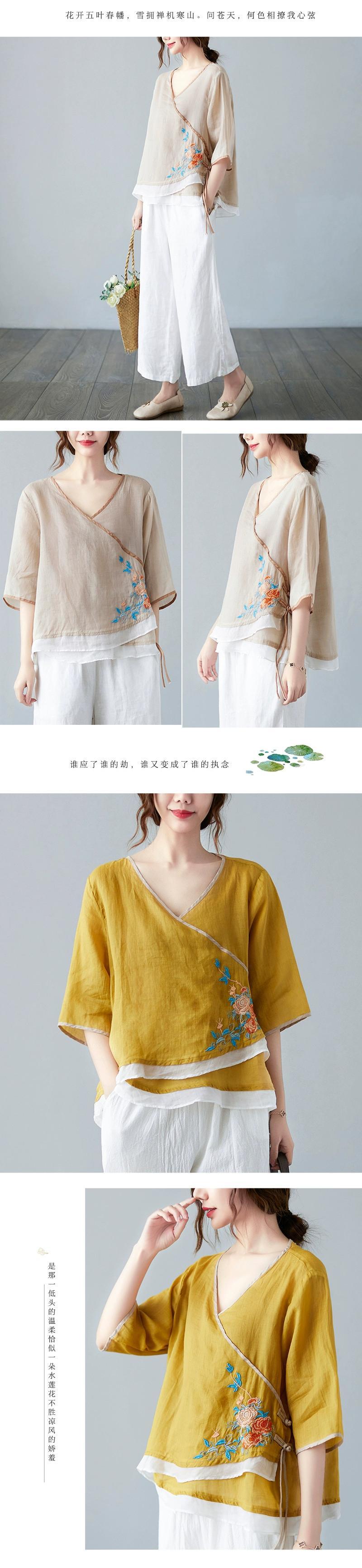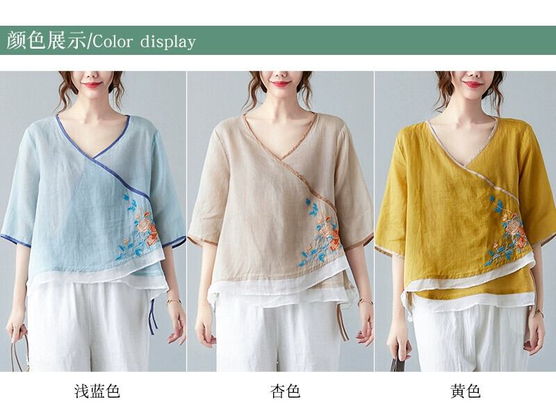 中国風の綿とリネンのシャツの女性の夏 2021 レトロプレートボタン刺繍 V ネックルーズ大きいサイズのリネン日焼け止めトップ レッド コットン 大きめサイズ サマー 夏物 Vネック sine51740876640