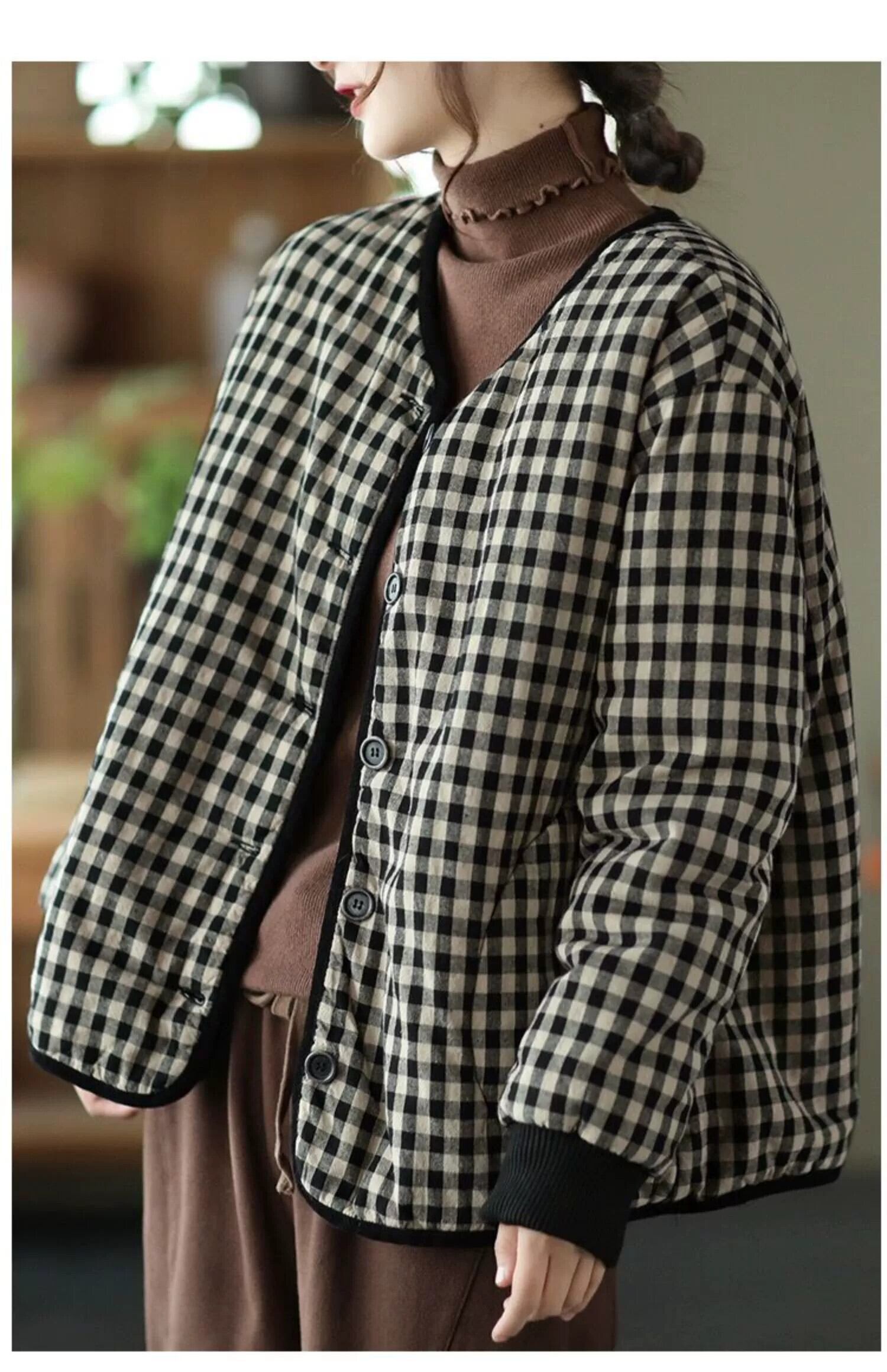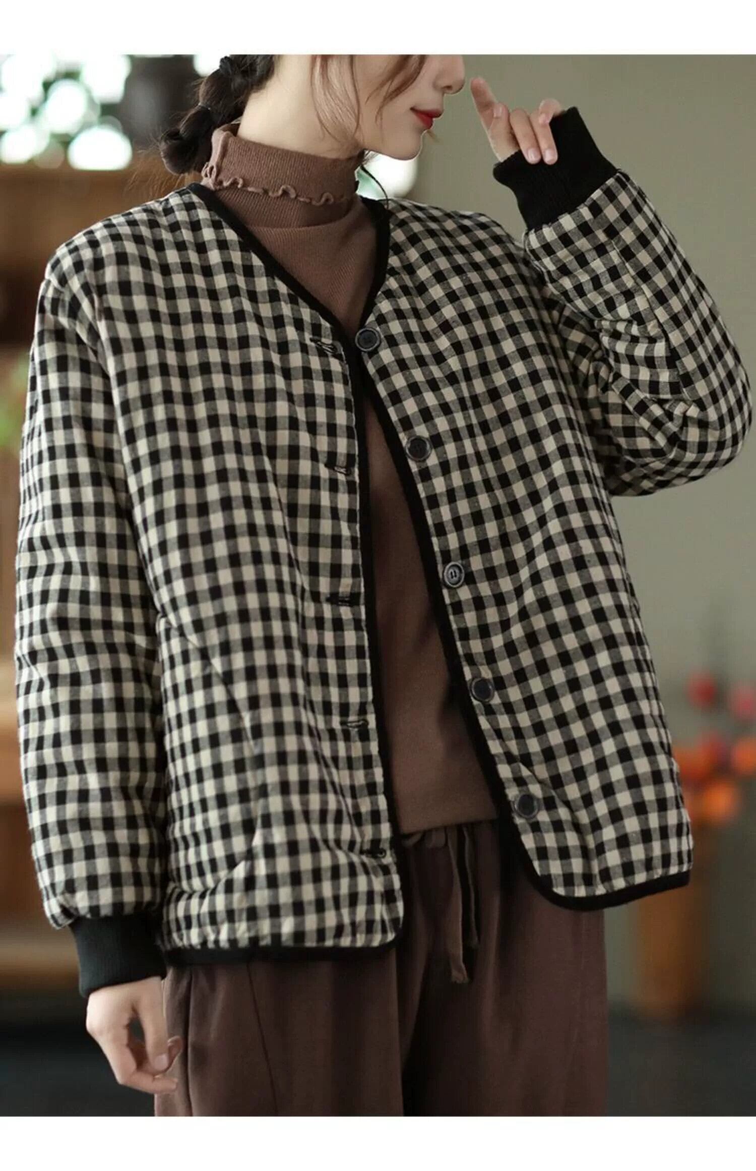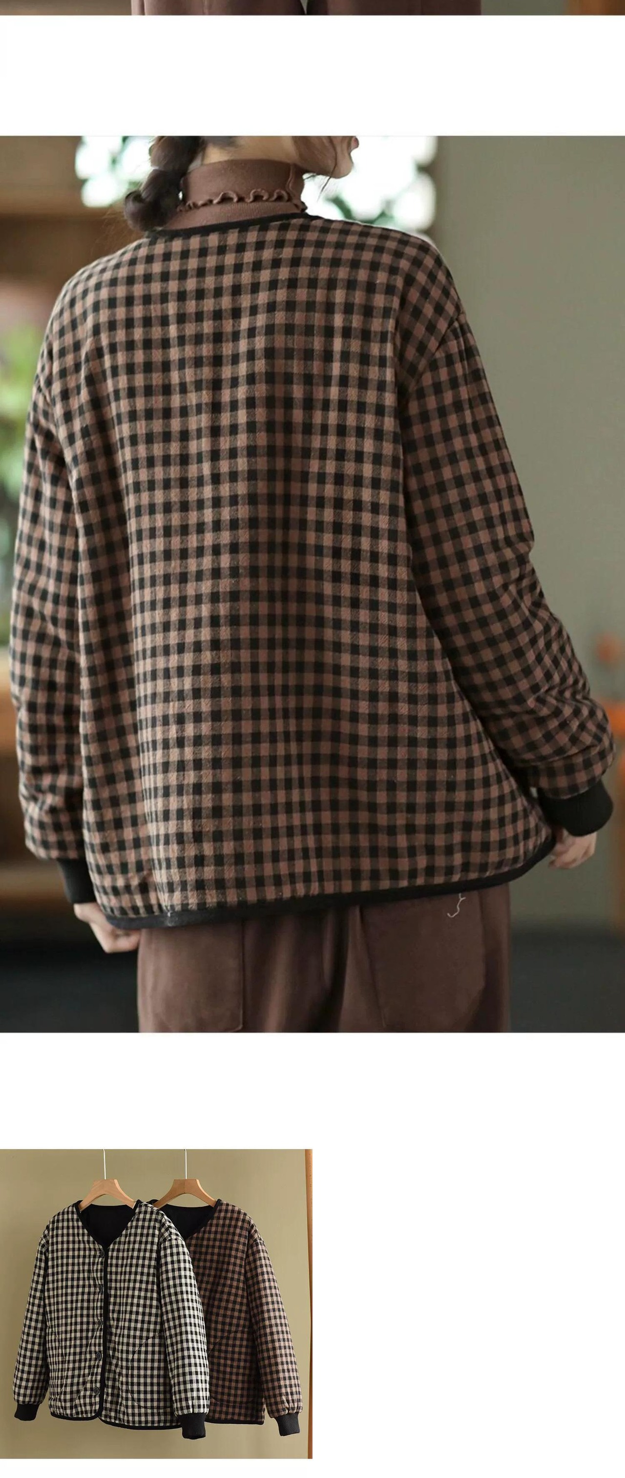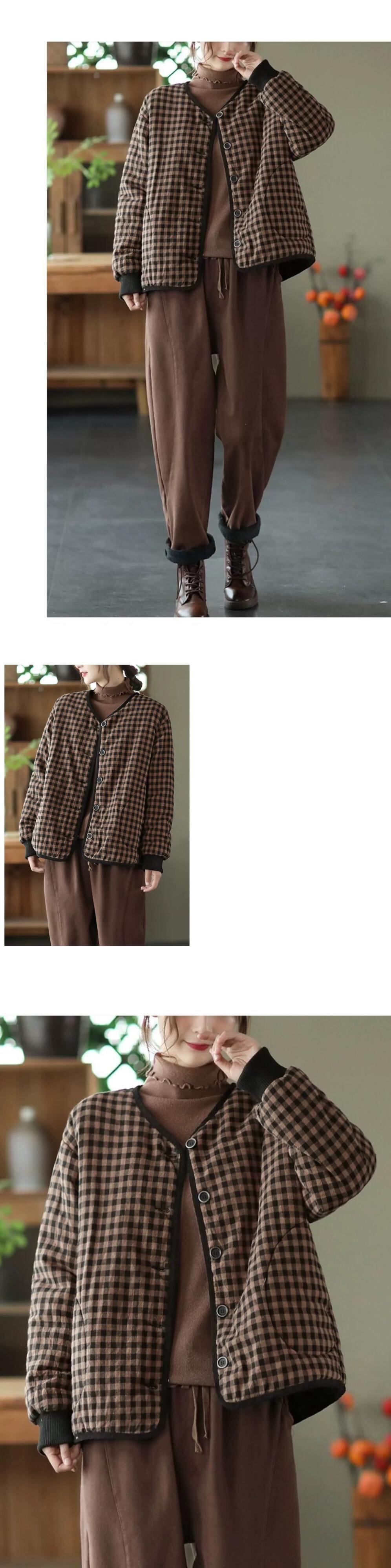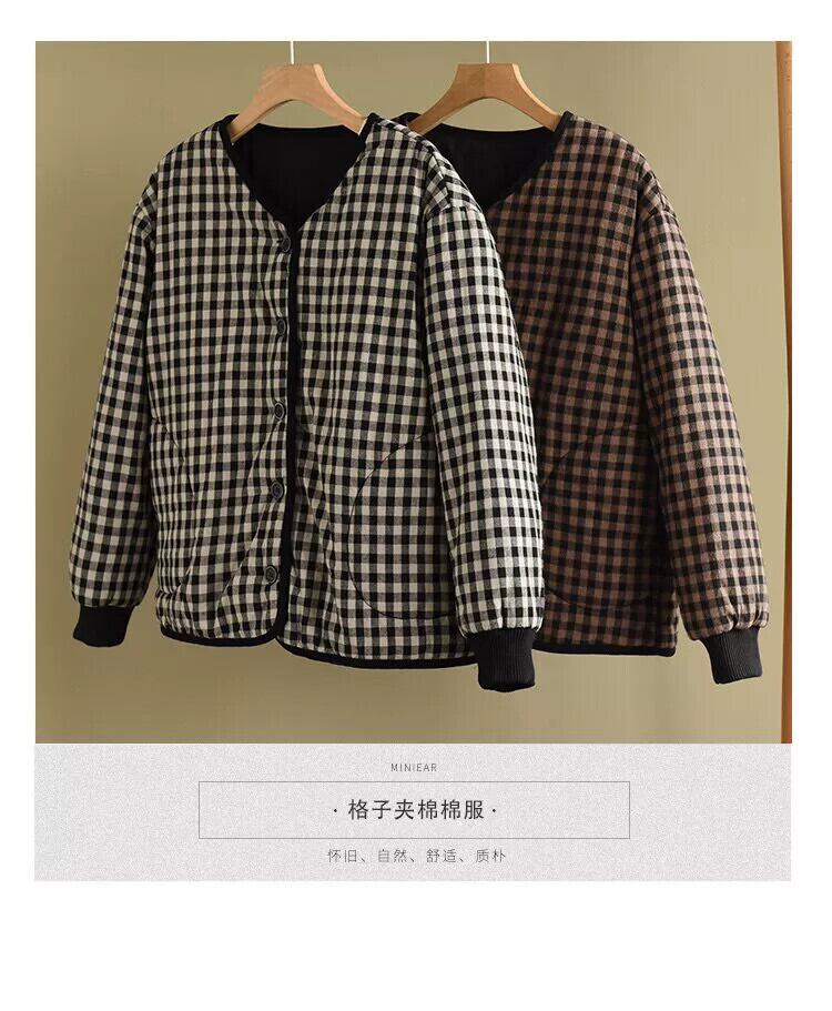 クリアランスリーク〜カウンター最終在庫レディースレトロキルティングチェック柄コットンコートルーズVネック厚く暖かい野球ユニム sine90029519736